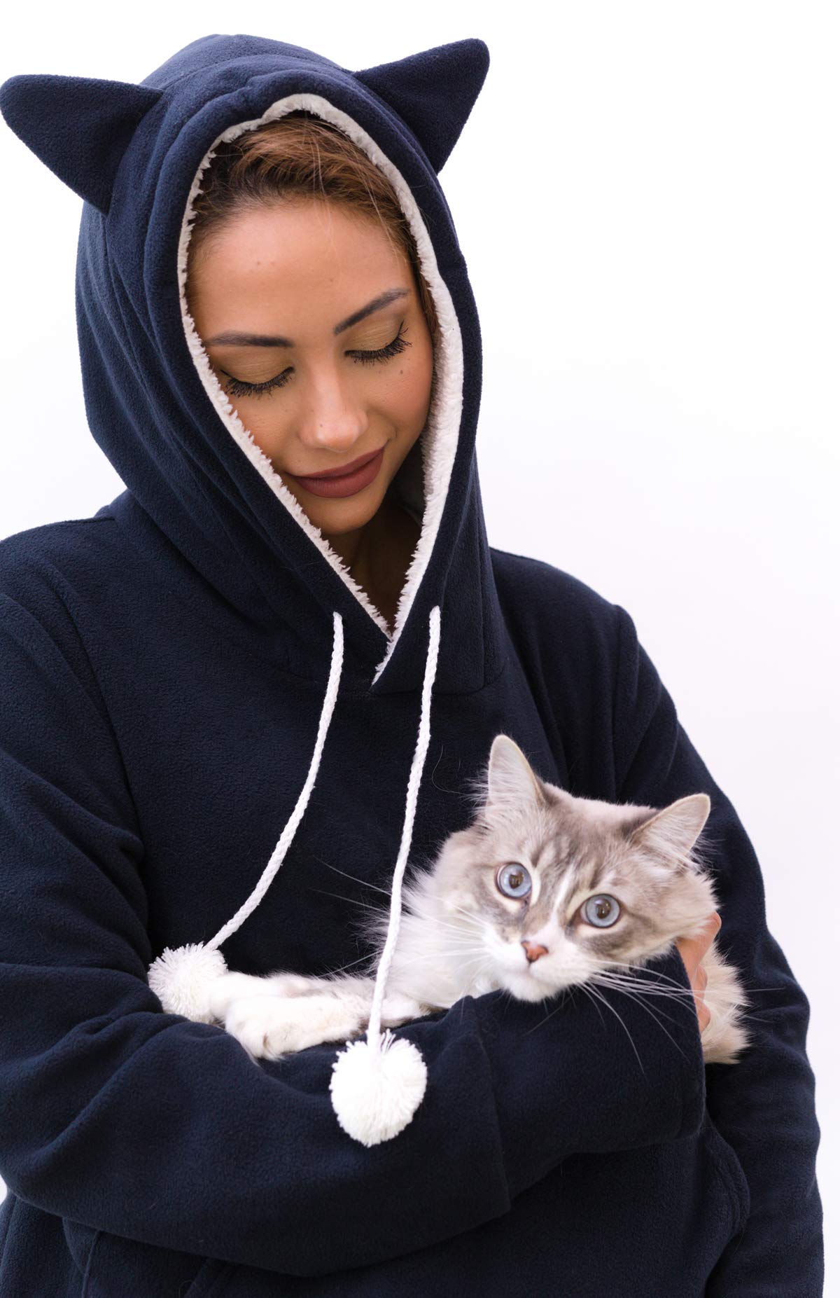 KangaKitty is the ultra-comfortable 100% cotton fleece sweatshirt that is made for you and your cat! It features a built-in front pouch that allows you to carry your kitty everywhere you go. Be hands free while your cat is snuggled up in your pouch allowing you to be together but move freely. Designed to be roomy, comfortable, and secure. Your kitty will love being close while on the go, or just relaxing on the couch. The pouch has a snap closure, adjustable drawstring for the purrfect fit, and the lining is removeable and washable. KangaKitty also features playful cat ears on the hood - not feeling playful? No problem! Easily hide the cat ears by tucking them into the hidden pockets in the hood. Your kitty will love playing with the pom pom strings and you’ll love the thumb holes on each sleeve and the traditional front hoodie pocket. KangaKitty is the purrfect 2-in-1 sweatshirt and cat carrier! Keep your kitty calm and comfortable wherever you are. Not a cat person? Kangakitty is also great for small dogs! Machine washable for easy cleaning. Size Medium 26.5' length by 40' wide, Large 27.5' length X 43' wide, X-Large 28.5' length X 46' wide, XX-Large 29' length X 49' wide