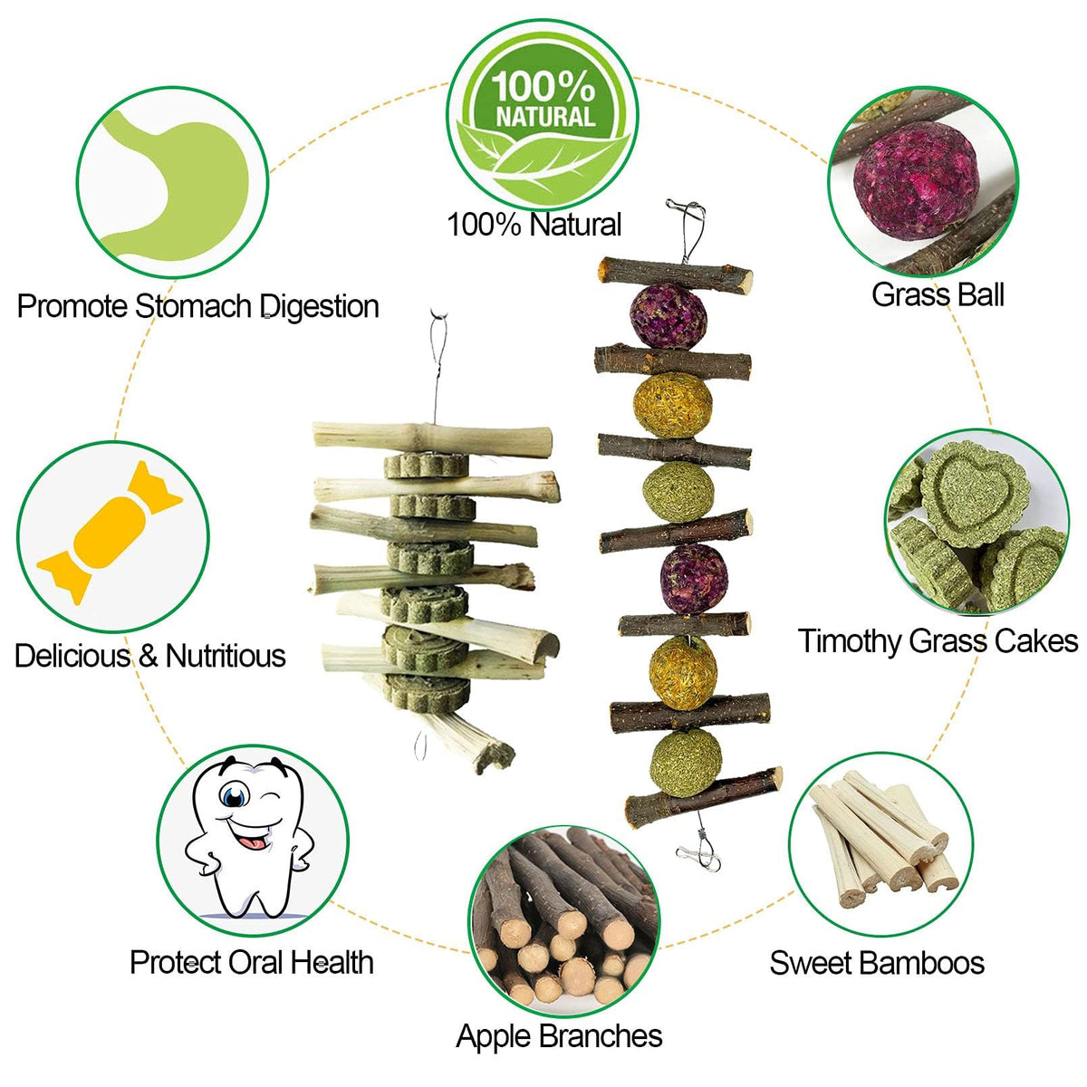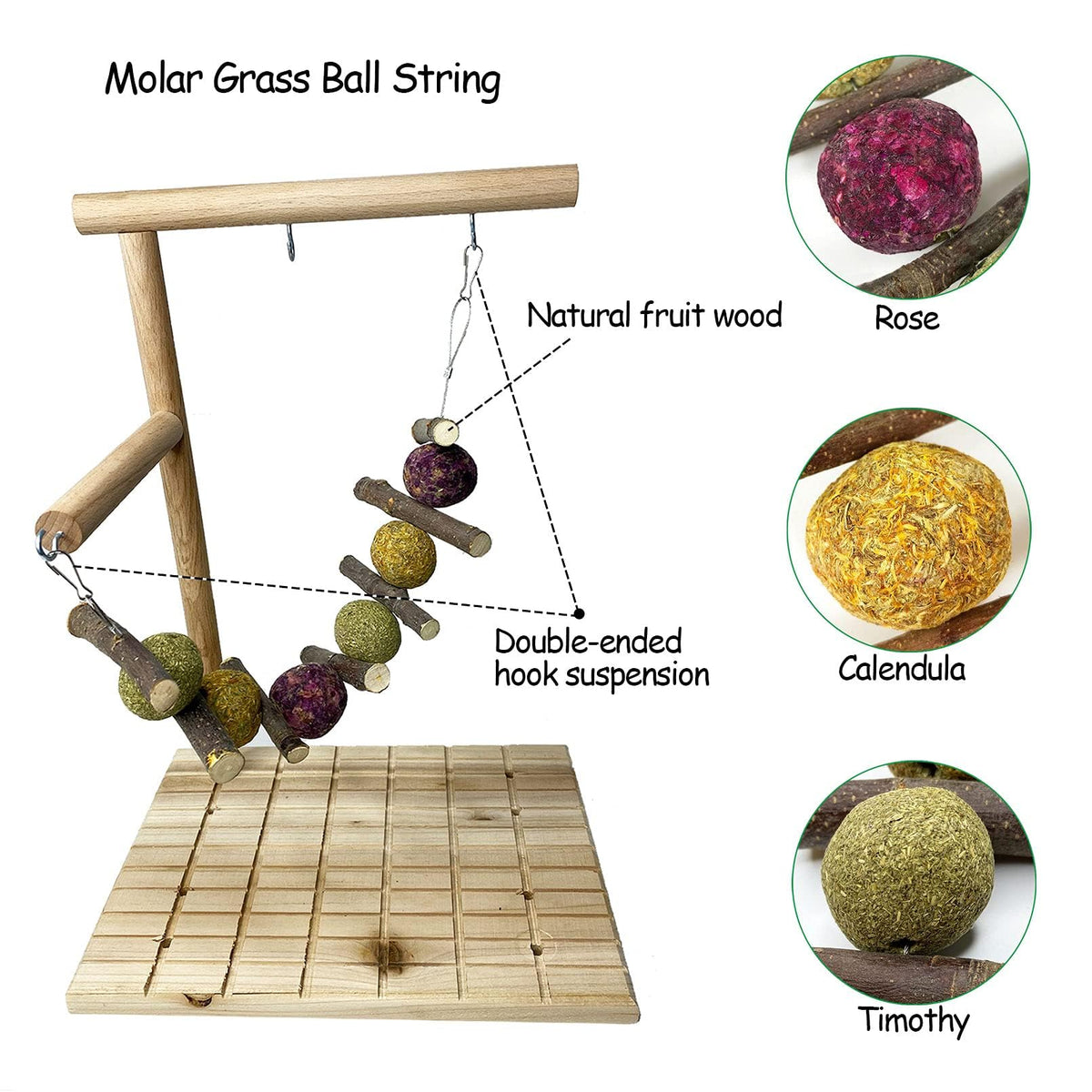 The pet scratch board platform made of wooden materials is safe, durable and chewable. The platform can help pets grind their nails and prevent them from being too long. It is comes with a variety of hanging snack toys to help pets grind their teeth, promote intestinal peristalsis, and improve appetite. FEATURES: 1. Rotatable pet wood platform is specially designed for small pets such as bunny, guinea pigs, chinchilla, hamster, gerbil, mouse, etc. We can hang pets loved toys or treats to help them take more time to play or exercise. 2. Sweet bamboos grass cakes and fruit wood flowers grass balls are strung together with metal wire for easy hanging. You can hang them on the wooden platform to attract the attention of small pets. 3. Chewing toys can help pets relieve anxiety and stress and prevent them from chewing on cages or other furniture. Keep them healthy and active. 4. Have the most intimate interaction with our pet, this toy is our best choice. Package Contents: 1 x wooden scratch board platform 1 x fruit wood flowers grass balls chew toy 1 x bamboo grass cakes chew toy 1 x corn leaf ball toy 1 x molar stone toy Note: 1.Please allow 1-3cm error due to manual measurement. Please make sure you do not mind before you bid. 2.Due to the difference between different monitors, the picture may not reflect the actual color of the item. Thank you! If you have any questions please feel free to contact us and we will try our best to solve them with in 24 hour. Thank you for your purchase and support!