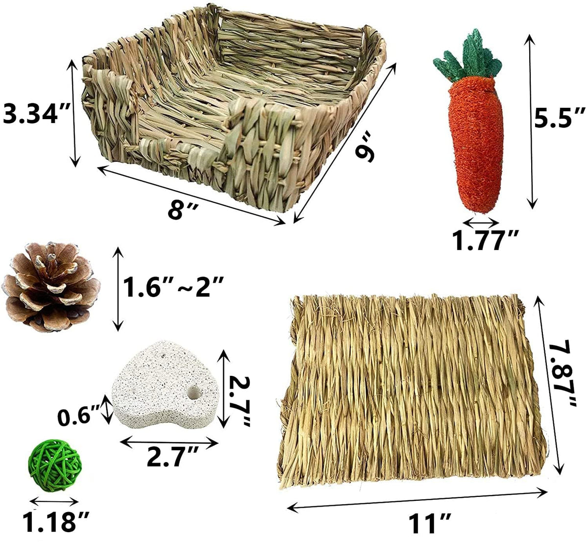 Size: Grass bed: 9 * 8 * 3.34 inches (L * W * H) Hay mat: 11 * 7.87 inches Pine cones: about 1.6~2 inches Loofah carrot: 5.5 * 1.77 inches Volcanic rock grinding stone: 2.7 *2.7 * 0.6 inches(L * W * H) Rattan balls: diameter 1.18 in