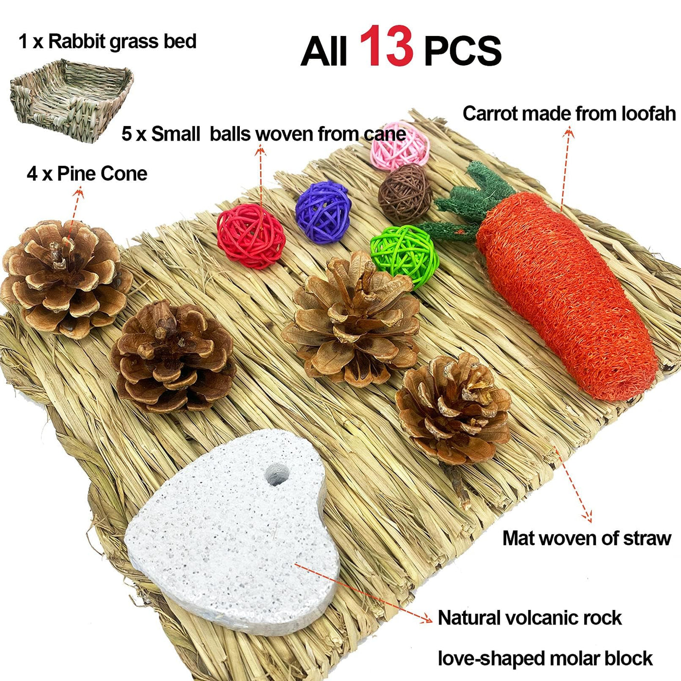 Package Contents: 1 x Grass bed 1 x Grass mat 4 x Pine cone 1 x Loofah carrot 1 x Grinding stone (heart-shaped and square-shaped random delivery) 5 x Rattan ball(random color)