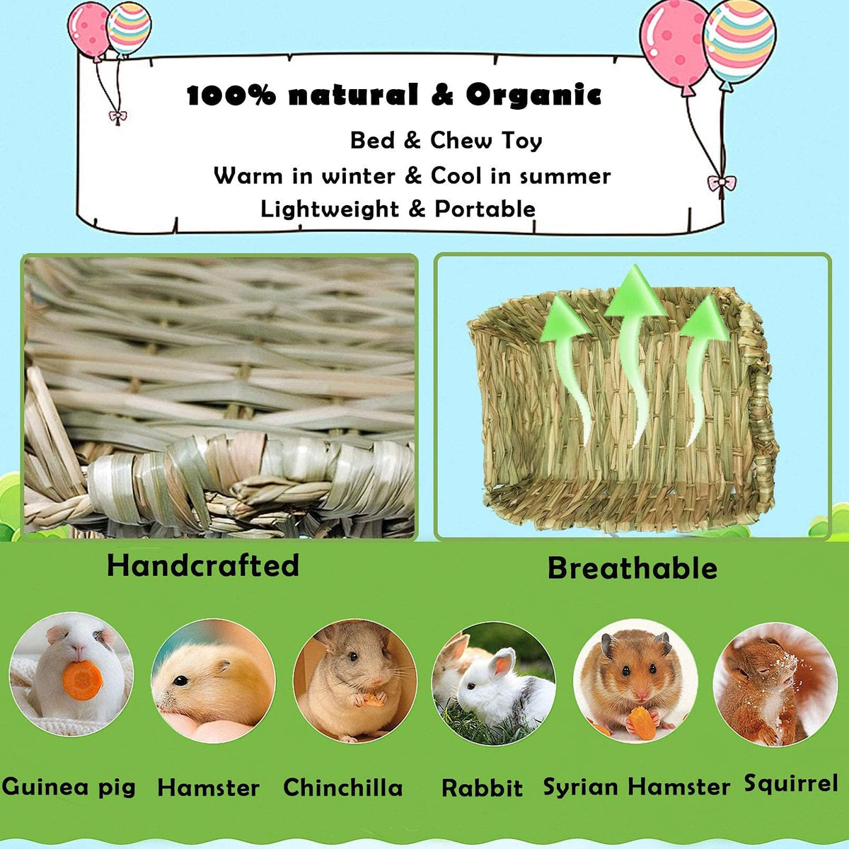 Natural straw woven bed and mat, soft and comfortable, warm in winter and cool in summer. Suitable size for easy placement in pet cages. With a variety of chewing toys, small pets can chew and play on the grass bed or pad, reduce the boredom of pets, give small pets more entertainment time. Grass beds and MATS are suitable for small animals such as bunny, hamster, guinea pig, small rabbit, cat, chinchilla, gerbil and squirrel.
