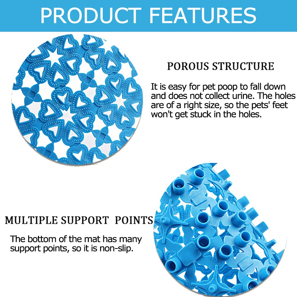Our cage mat is made from soft plastic which is safe non-toxic comfortable and not easy to deformation. SPECIFICATION Material: PE plastic Dimension: 11.6 7.8 0.39 Weight: 4 2.57oz Colour: blue Application: pet cages pet toilets and bathroom