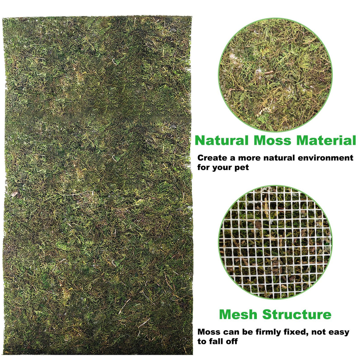 ≪P≫Note:≪/P≫≪P≫Since It Is Made Of Natural Moss, It Cannot Be Cleaned With Water. For Normal Cleaning, Gently Shake Off The Debris On The Mat And Then Gently Wipe It With A Damp Towel.≪/P≫≪P≫1. Natural Material≪/P≫≪P≫Made Of Natural Moss, It Builds A Habitat Closest To The Natural Ecology For The Reptiles, Making Them Feel As If They Are In Their Native Habitat, Which Helps To Reduce The Tension And Promotes Their Physical And Mental Health.≪/P≫≪P≫≪/P≫≪P≫2.Mesh Structure≪/P≫≪P≫The Back Of The Mat Is Made Of Mesh Structure, The Moss Can Be Fixed Tightly On It, And At The Same Time, It Can Be Used As An Aid When Cutting, Which Is Convenient For You To Cut Faster And Better.≪/P≫≪P≫≪/P≫≪P≫3.Easy To Cut≪/P≫≪P≫You Can Freely Cut The Mat According To The Size And Shape Of The Reptile Enclosure, So That The Mat And The Tank Can Be More Suitable For Your Pet And Give Them A Comfortable Environment.≪/P≫≪P≫Suitable For Most Reptiles Such As Geckos, Snakes, Lizards, Chameleons, Squirrel Lizards, Etc. They Can Rest And Play On The Mat Without Worry.≪/P≫