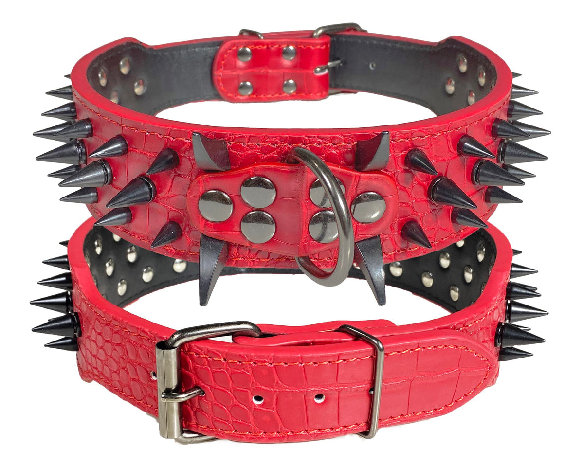 Kawagogo Spiked Studded Dog Collar With Large Sharp Spikes,2 Inch Wide Red Leather Dog Collar,Anti-Bite,Fit Large Medium Dogs,Pi