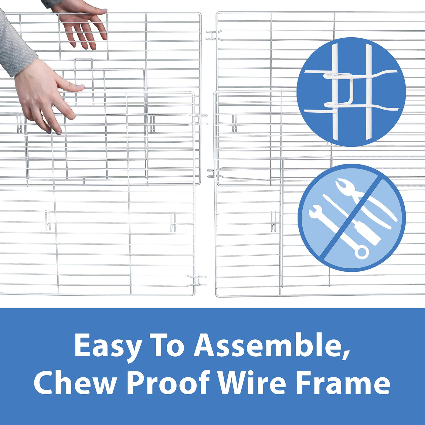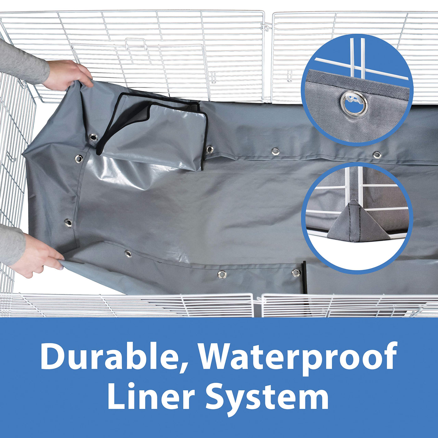 Q: What materials are used in this habitat?A: The habitat is constructed with a durable wire frame that includes chew-proof latches for safety. It also comes with a waterproof liner that securely attaches to the frame.
