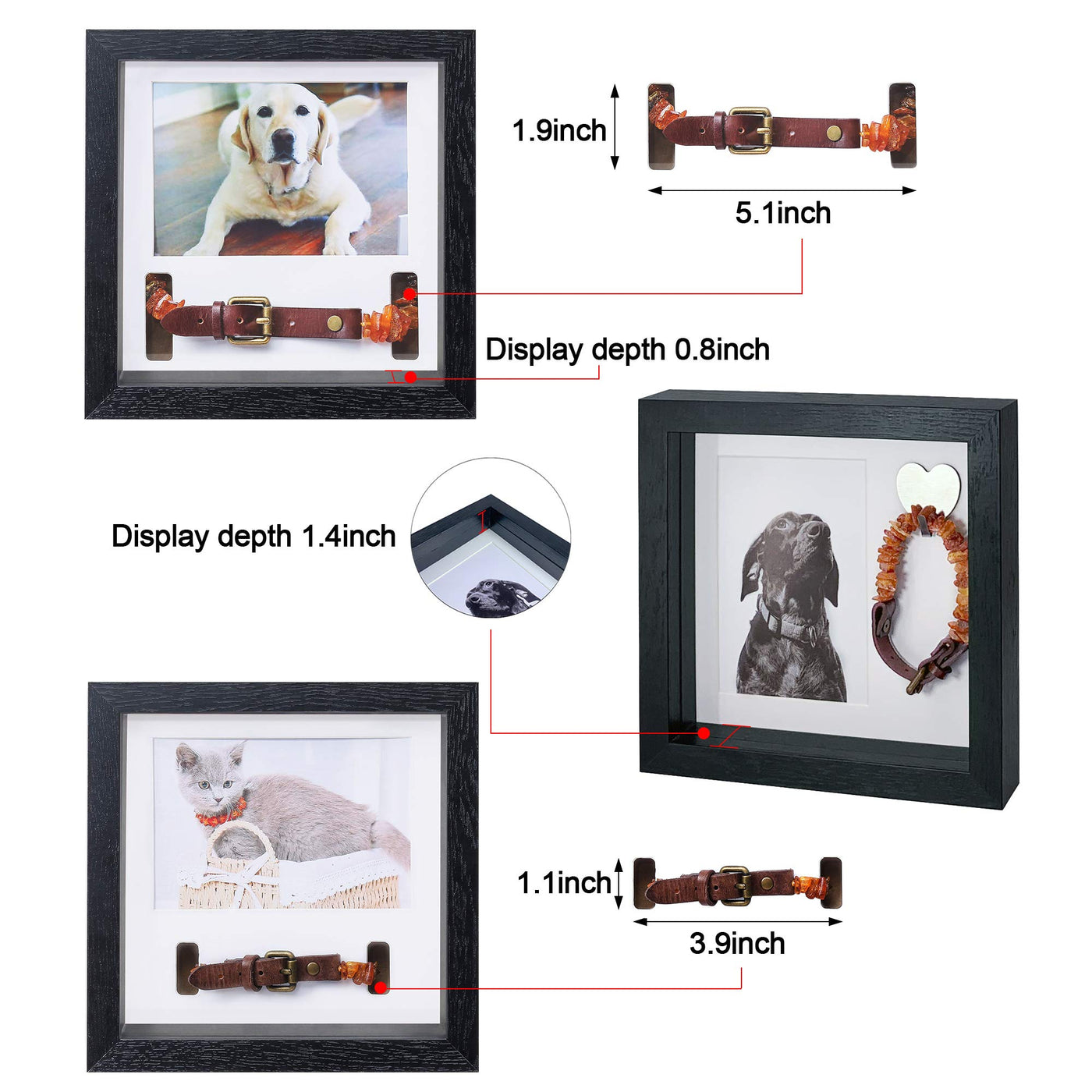 Dog collar frame display your best friend's collar together with your favorite ,memorial photo. Shadowbox frame holds diffirent size collars. Pet collar frame can be hung on the wall with sawtooth hooks, and display on table or shelf with the kickstand. This memorial wooden frame holds a 4'x6' photo of your furry friend. The 2 diffirent holes size collar mats are designed to fit more adjustable collars(small pet and large dogs).