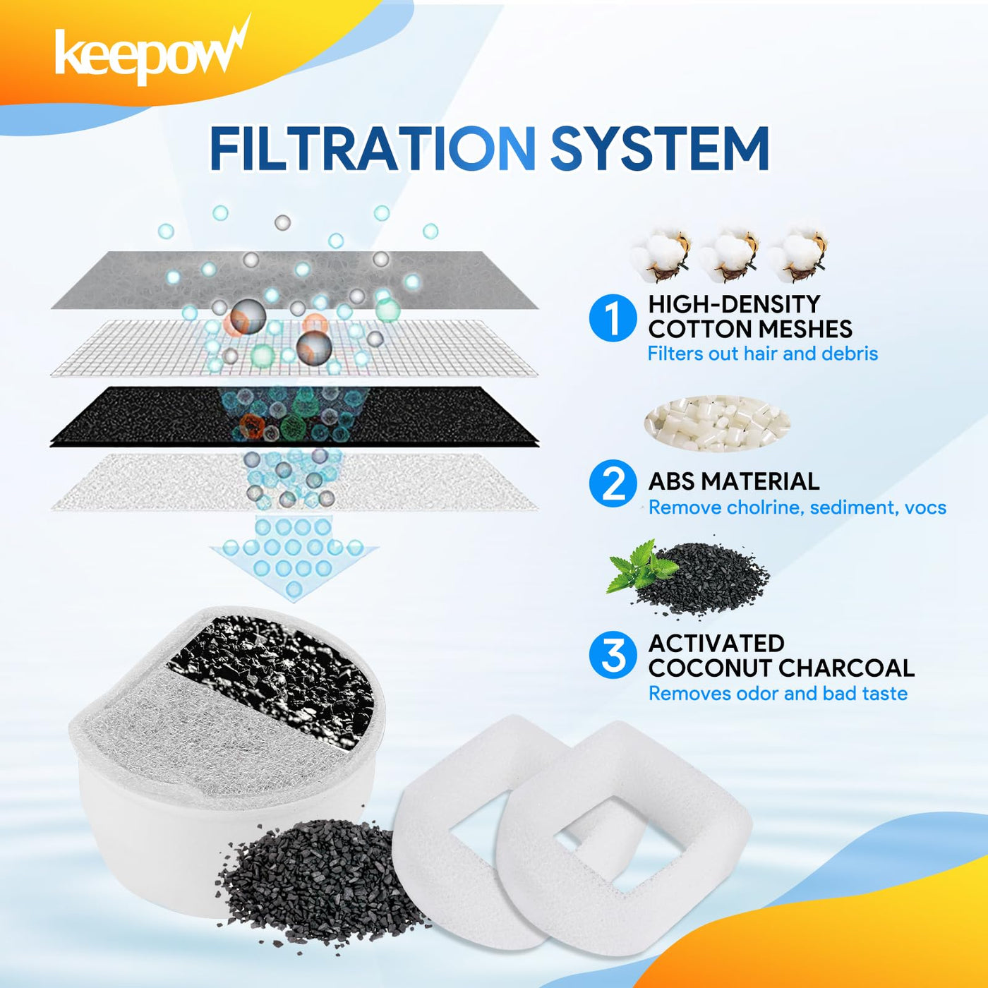 Q: What benefits does the KEEPOW Cat Water Fountain Filter provide for my pets?A: The KEEPOW Cat Water Fountain Filter helps to keep your pet's water clean and fresh, encouraging them to drink more and promoting better hydration. By filtering out impurities and odors, it enhances the overall quality of water, contributing to your pet's health and well-being.