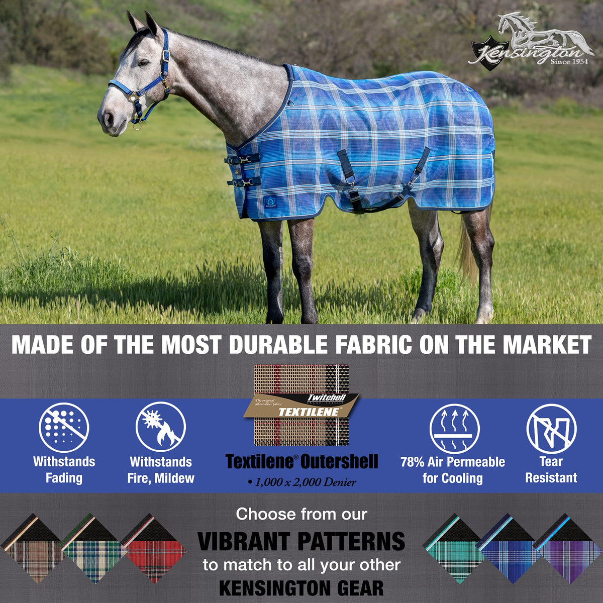 Kensingtons Protective Sheet Is Constructed Of Textilene Mesh, And Its Surefit Cut Fits A Wide Range Of Horse Body Confirmations. Textilene Is A 1000 X 2000 Denier Mesh That Has Many Benefits Including: 73% Uv Protection, 78% Air Permeability, Fly And Insect Protection, Fire Resistance, And Does Not Absorb Heat From The Sun Or Your Horse. The Weave Keeps Dirt And Debris Off Your Horses Coat And Offers Gentle Grooming As Your Horse Moves That Brings Out Their Natural Oils, And Helps Release Loose Hair Which Reduces Grooming Time, Which Is Especially Helpful During Shedding Seasons. The Uv Protection Keeps Your Horses Coat Safe From Bleaching Out, And Prevents Sunburns. The Air Permeable And Non-Heat Absorbing Material Keeps Your Horse Cool And Comfortable In The Warm Months. In The Event Of A Fire This Material Resists Burning, And Will Stick To Itself, Not Your Horse. This Sheet Features Quick Clip Front Closures That Are Adjustable With Buckles, A Padded Wither, Leg Arches That Provide Additional Adjustability For The Detachable 2 Criss Cross Belly Straps With Snaps And D-Rings, Removable, Adjustable Leg Straps With Snaps And D-Rings, And Removable Tail Cover.