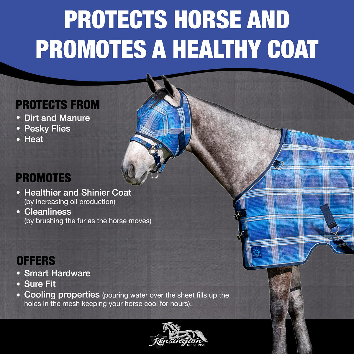Kensingtons Protective Sheet Is Constructed Of Textilene Mesh, And Its Surefit Cut Fits A Wide Range Of Horse Body Confirmations. Textilene Is A 1000 X 2000 Denier Mesh That Has Many Benefits Including: 73% Uv Protection, 78% Air Permeability, Fly And Insect Protection, Fire Resistance, And Does Not Absorb Heat From The Sun Or Your Horse. The Weave Keeps Dirt And Debris Off Your Horses Coat And Offers Gentle Grooming As Your Horse Moves That Brings Out Their Natural Oils, And Helps Release Loose Hair Which Reduces Grooming Time, Which Is Especially Helpful During Shedding Seasons. The Uv Protection Keeps Your Horses Coat Safe From Bleaching Out, And Prevents Sunburns. The Air Permeable And Non-Heat Absorbing Material Keeps Your Horse Cool And Comfortable In The Warm Months. In The Event Of A Fire This Material Resists Burning, And Will Stick To Itself, Not Your Horse. This Sheet Features Quick Clip Front Closures That Are Adjustable With Buckles, A Padded Wither, Leg Arches That Provide Additional Adjustability For The Detachable 2 Criss Cross Belly Straps With Snaps And D-Rings, Removable, Adjustable Leg Straps With Snaps And D-Rings, And Removable Tail Cover.