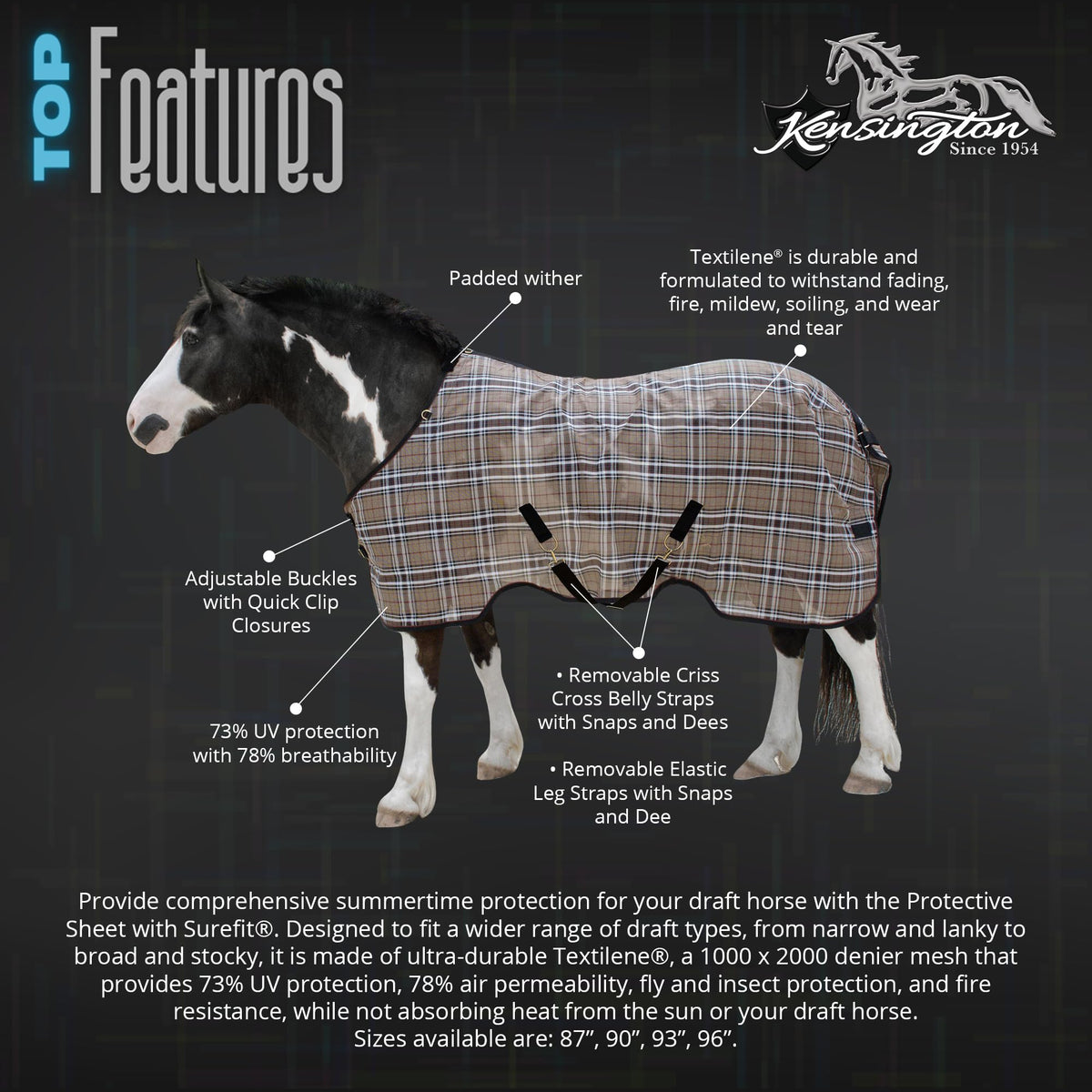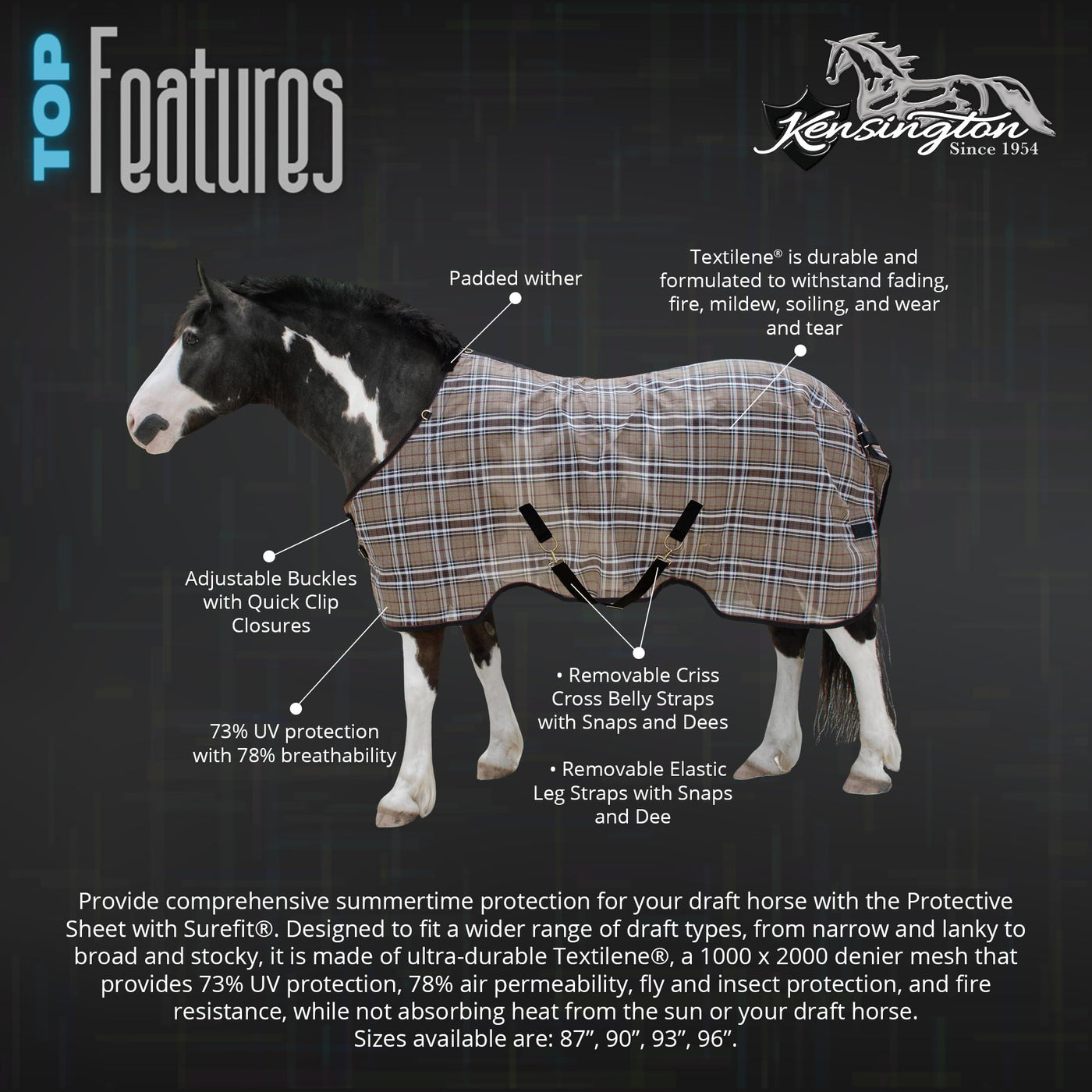 Kensingtons Protective Sheet is constructed of Textilene mesh, and is cut to fit a wide range of body confirmations. Textilene is a 1000 x 2000 denier mesh that has many benefits including: 73% UV protection, 78% air permeability, fly and insect protection, fire resistance, and does not absorb heat from the sun or your draft horse. The weave keeps dirt and debris off your draft horses coat and offers gentle grooming as your draft horse moves that brings out their natural oils, and helps release loose hair which reduces grooming time, which is especially helpful during shedding seasons. The UV protection keeps your draft horses coat safe from bleaching out, and prevents sunburns. The air permeable and non-heat absorbing material keeps your draft horse cool and comfortable in the warm months. In the event of a fire this material resists burning, and will stick to itself, not your draft horse. This sheet features quick clip front closures that are adjustable with buckles, a padded wither, leg arches that provide additional adjustability for the detachable 2 criss cross belly straps with snaps and d-rings, removable, adjustable leg straps with snaps and d-rings, and removable tail cover.