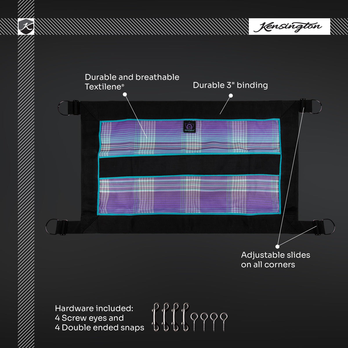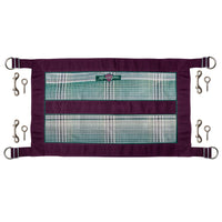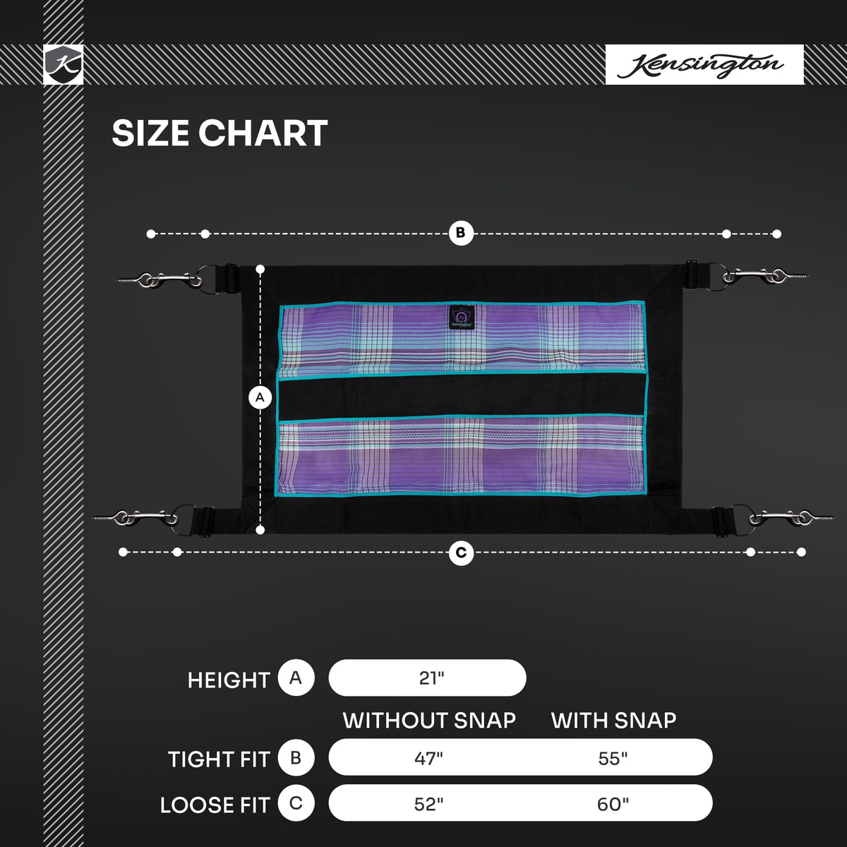 STALL GUARD W/ HARDWARE ALL HARDWARE INCLUDED - 4 DOUBLE ENDED SNAPS AND SCREW EYES Add a touch of elegance to your stall door opening and keep your horse safely in the stall. Made of durable Textilene mesh and bordered on all 4 sides with 3 nylon webbing. A generous 34 1/2 inches long by 21 inches wide this guard is adjustable to fit openings up to 47 wide using the adjustment straps. Beautiful coordinating hardware completes the look and includes heavy-duty D rings for easy fastening, double ended snaps and screw eye for attaching to the barn door. The solid web center is ideal for personalization. (Includes all hardware) Item Code: KSG
