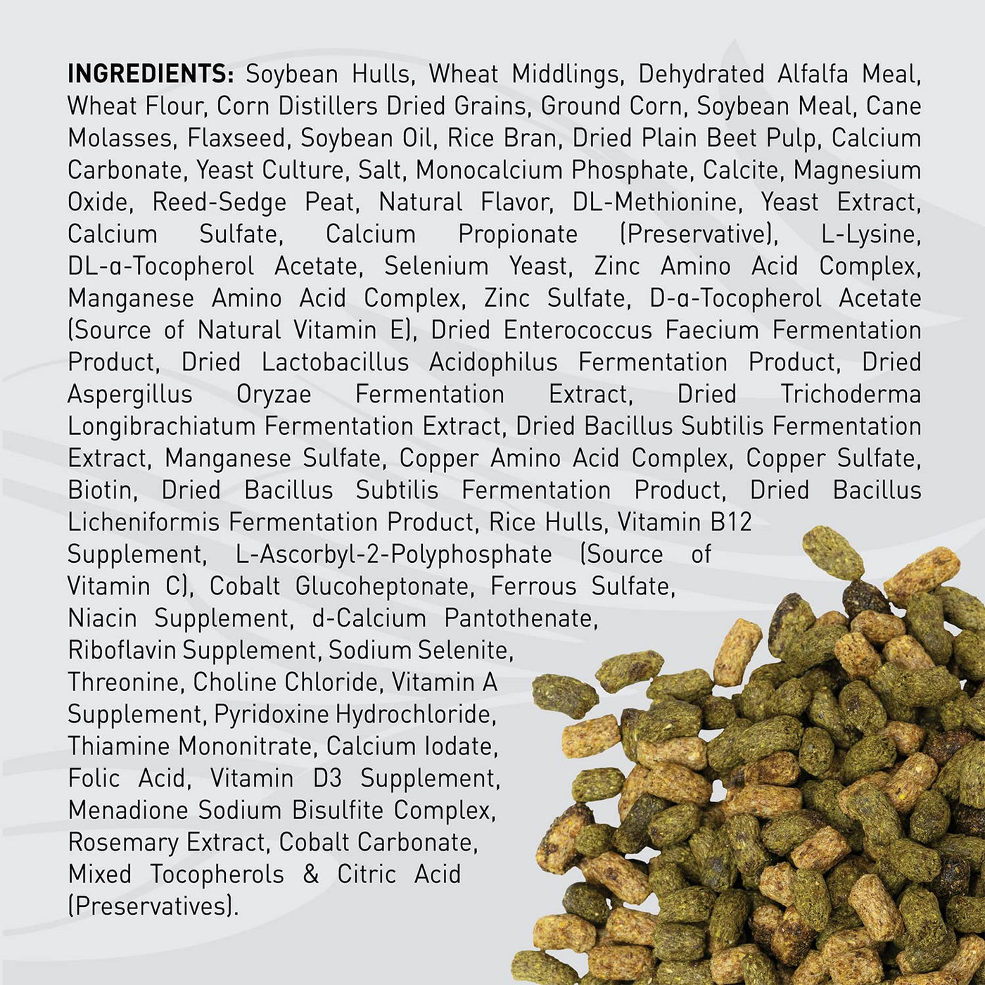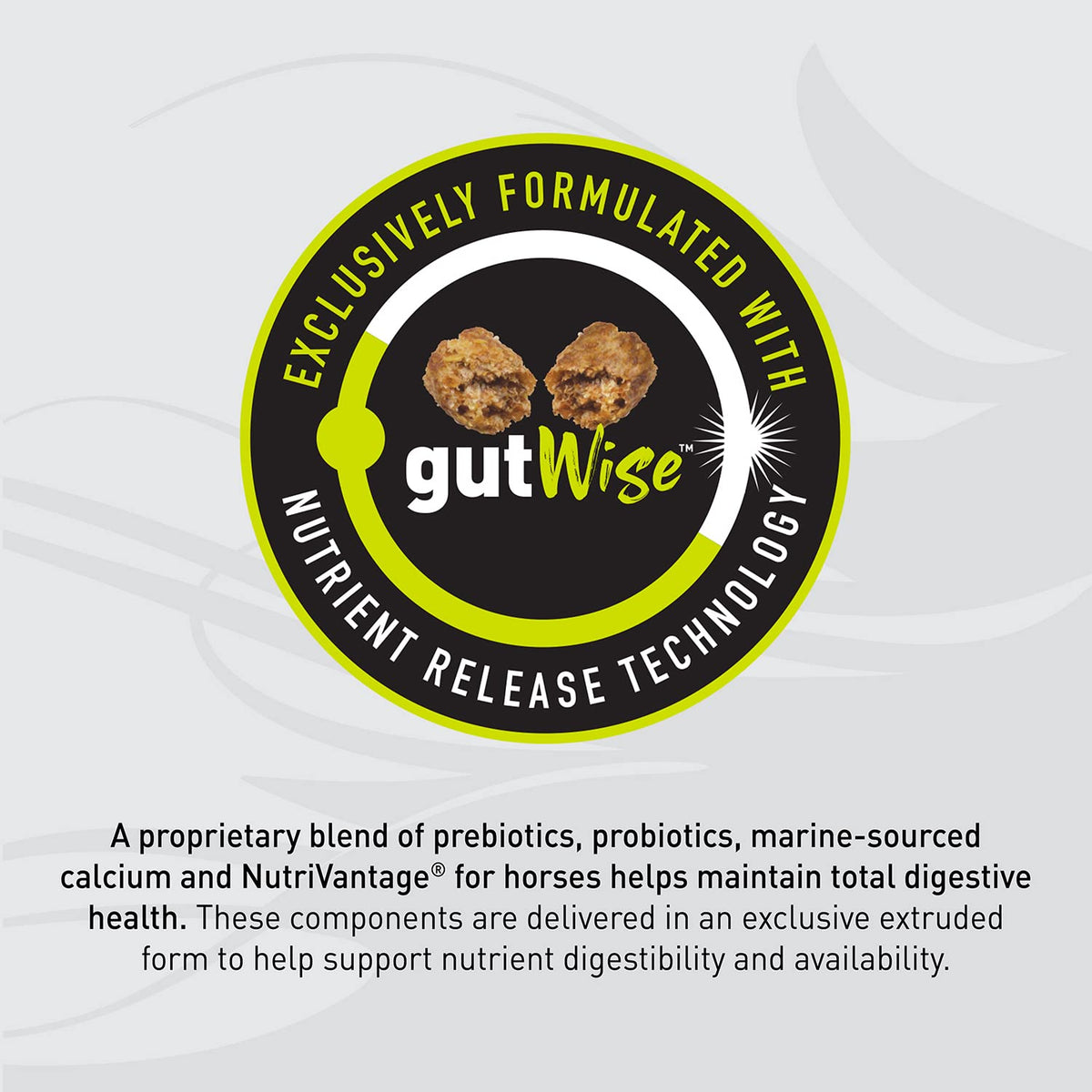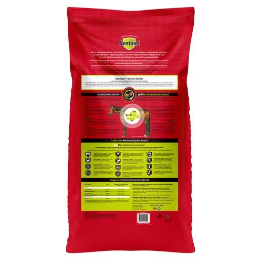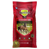 A nutrient release formula feed for active senior horses. Sentinel Active Senior is a high-fat, high-fiber feed containing a fortified balance of nutrients and an exclusive blend of natural additives to meet the increased demands of active senior horses, senior horses requiring additional body condition or hard keepers and performance horses fed lower protein hay. This unique formula is also recommended for certain horses where maintenance of digestive and metabolic health is a challenge. An extruded feed, Sentinel Active Senior offers a safe and natural way to provide essential nutrition that may be easily digested for optimal nutrient utilization.