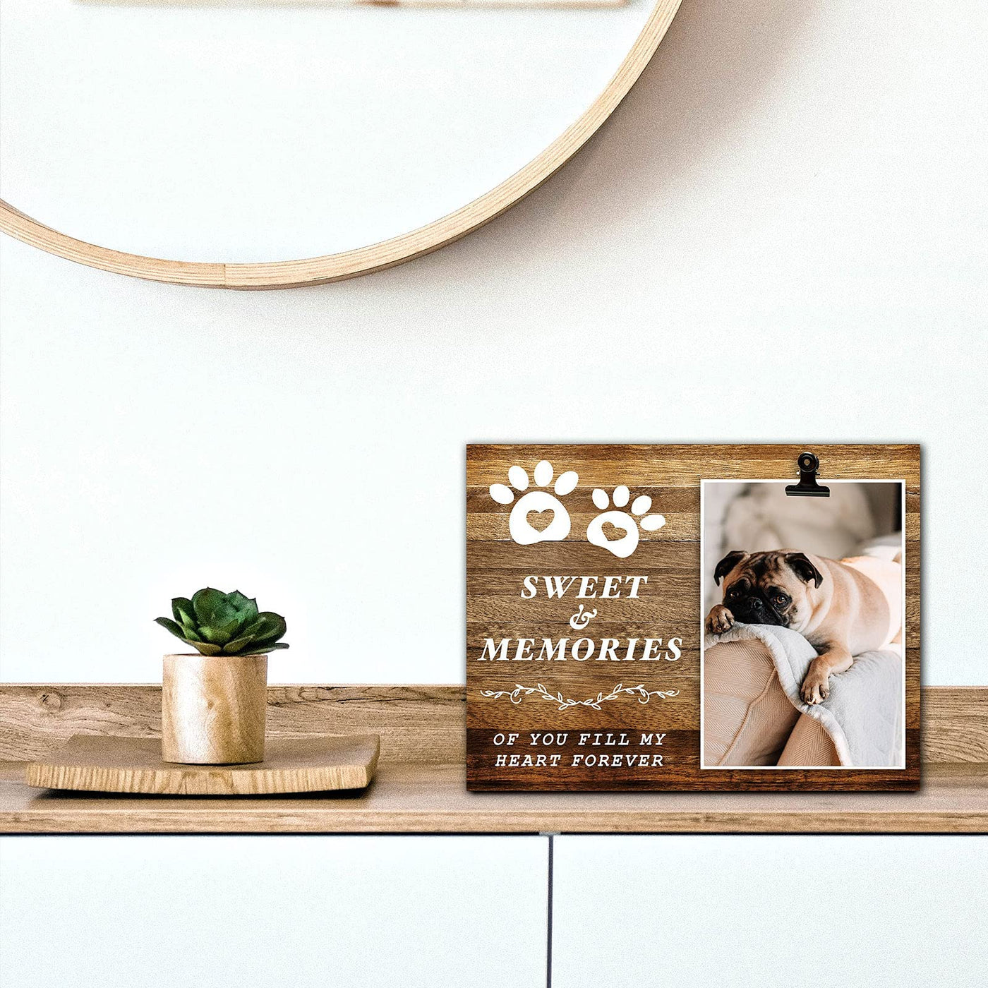 Material: 100% natural dog photo frame no harmful chemicals or paints were used. You can put it anywhere you like bedroom living room shelf desk and so on.
