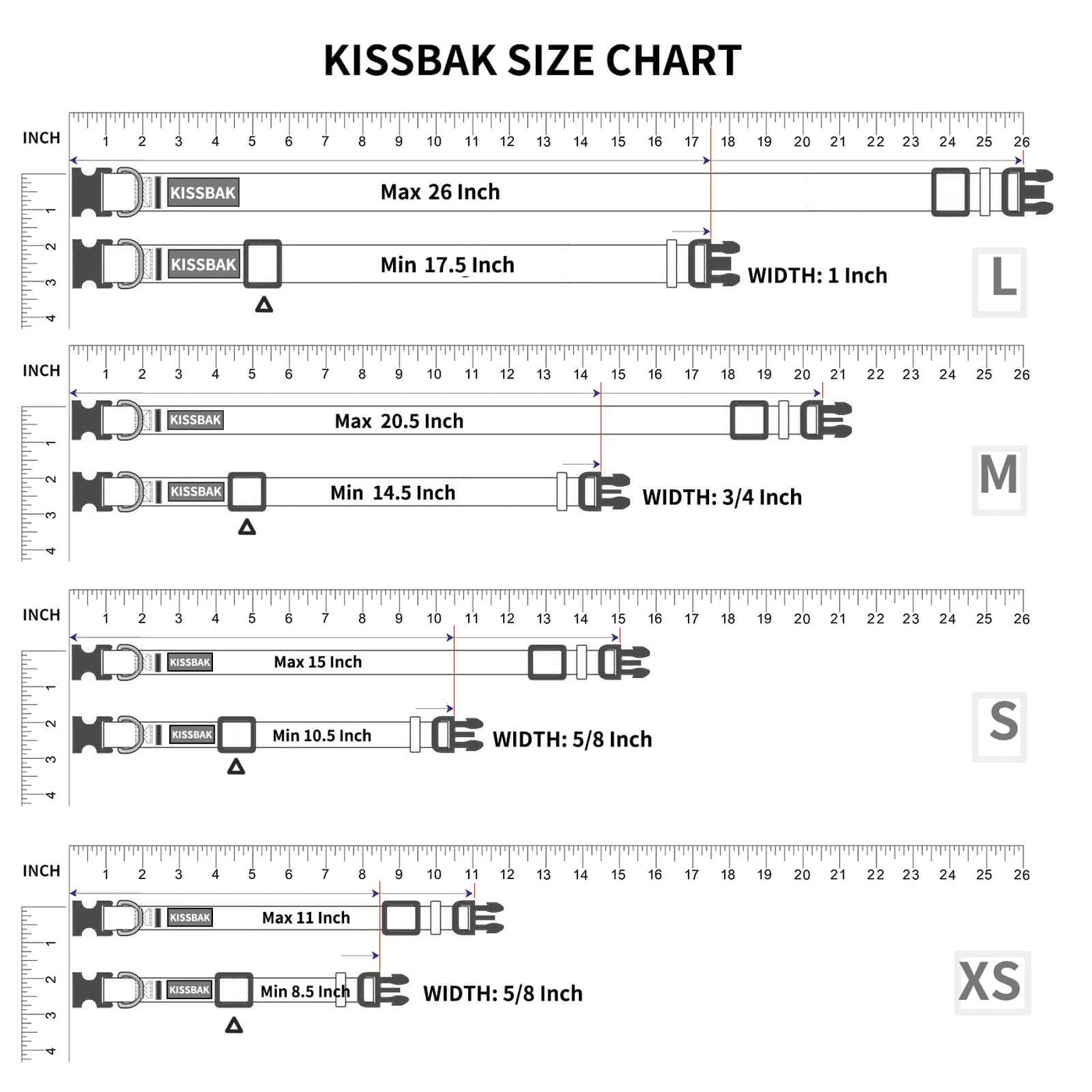 Q: What sizes are available for the KISSBAK Dog Collar?A: The KISSBAK Dog Collar comes in multiple sizes to ensure a perfect fit for your dog. The Medium size is designed to fit necks from 14.5 to 20.5 inches. It's essential to measure your dog's neck accurately to select the appropriate size.