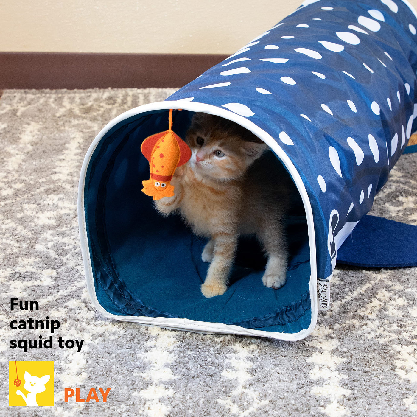 Youd Think A Cat Would Rather Have A Fish In Its Belly Than Run Into The Belly Of A Whale, But Not So With The Whale Shark Tunnel By Kitty City. Thats Because It Combines Everything A Cat Could Love Into One Easy-To-Set-Up Playset. The Fun Whale Shark Exterior Is Actually A Cozy Tunnel For Your Cat To Run Through, Peer Out Of, Or Catnap Inside. Inside The Mouth Hangs A Fun Squid, Just Begging For A Paw Swipe. And On The Tail Of The Whale Theres A Scratch Pad For Your Cat To Keep Her Claws Keen - And Far Away From Your Favorite Furniture. And The Best Part For You? The Pop-Open Design Means You Can Set It Up In Seconds, And It Packs Away Compactly When Not In Use.