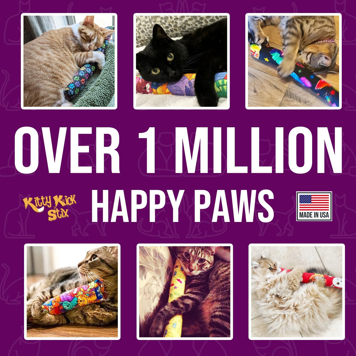 The original Catnip Kicker Toy but now available in 11” version (Set of 2), Handmade in USA by Cat lovers, this Cat Toy is the original and most popular Cat Nip Kicker Toy purrfect for your Cat! This interactive Cat & Kitten toy is packed with 100% potent catnip for all breeds. Cat’s have an instinct to use their rear paws to kick and cuddle. This toy helps with cat’s excise and playfulness between their owners. The Kitty Kick Stix Catnip Kickers 11” is our medium size cat toy, filled with potent catnip on the top, bottom, middle and throughout the toy. Includes (2) - 11' x 3.0' soft cotton catnip kickers, each handmade in the USA. Toys are cut, stuffed, packed with catnip in North America – each is made to order to ensure the absolute freshest catnip toy. Toys are DOUBLE STITCHED and packed with the freshest Canadian CATNIP 100% Guaranteed to WORK. MADE IN THE USA! ASSORTED FABRICS and SIZES available. Random cat-themed fabrics will be select for the 11” version of this toy.