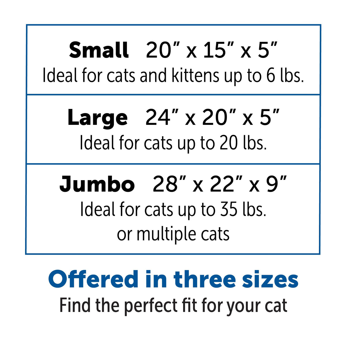Q: What sizes are available for the KittyGoHere Litter Box?A: The KittyGoHere Litter Box is available in multiple sizes: Small (20" x 15" x 5"), Large (24" x 20" x 5"), and Jumbo (28" x 22" x 9" with a 3" high opening). This variety allows you to choose the perfect size based on your cat's weight and needs.