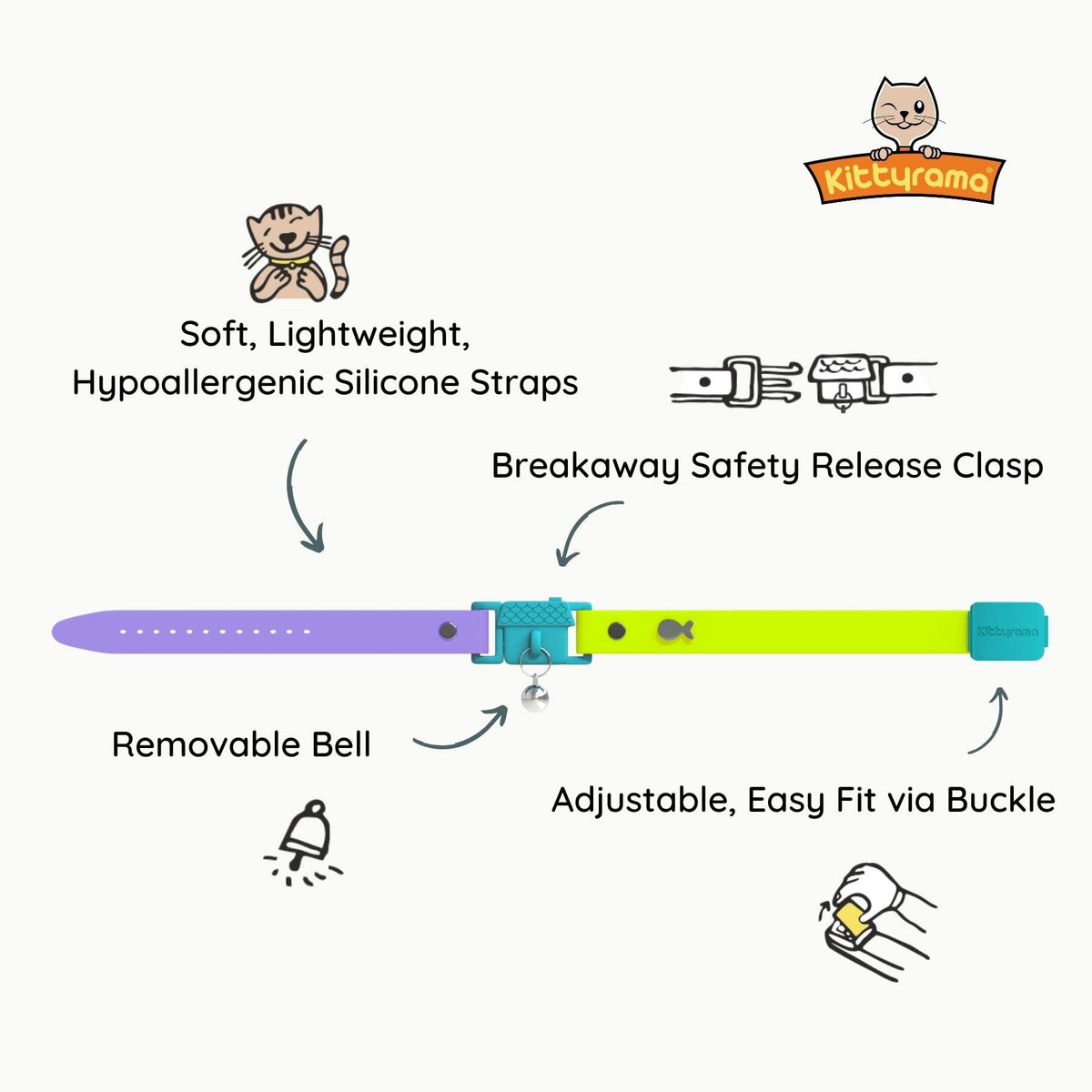 What makes Kittyrama cat collars the best in the land Unbeatable comfort: Our Silicon straps are so soft, smooth and lightweight, cats forget they have their cat collars on (except when they become the envy of all the other cats in the neighbourhood) Hypoallergenic, Breathable, Waterproof: Unlike fabric and leather cat collars, our hypoallergenic straps help to protect the neck area from moisture and heat, for less chances of irritation Ultra safe: Featuring quick release break away clasps, designed to open if a cat finds themselves caught in an adventure (the break away clasps open as cats pull with their bodies to free themselves) Perfect fit: Tailor the fitting to your catAs neck via the buckle with holes Our patented design wonAt let the fitting move with wear, ensuring comfort and safety every day Recommended by Vets and welfare experts: Kittyrama collars are the only cat collars to receive a cat Friendly award by International cat care, the global charity for the welfare of cats We are the cats that got the cream Kitten size or Adult size Kittens and adult cats have very different physiques and strength, and for safety and comfort require different cat collar sizes and break away clasps Our Kitten collars fit neck sizes between 57 inch and 73 inch Our Adult cat collars fit neck sizes between 77 inch - 104 inch Please measure your cats neck before purchase to ensure a safe fitting can be achieved Super Stylish: As seen in Vogue magazine We are so confident your cat will rock them so much, we are sorry in advance for any increase in cattitude