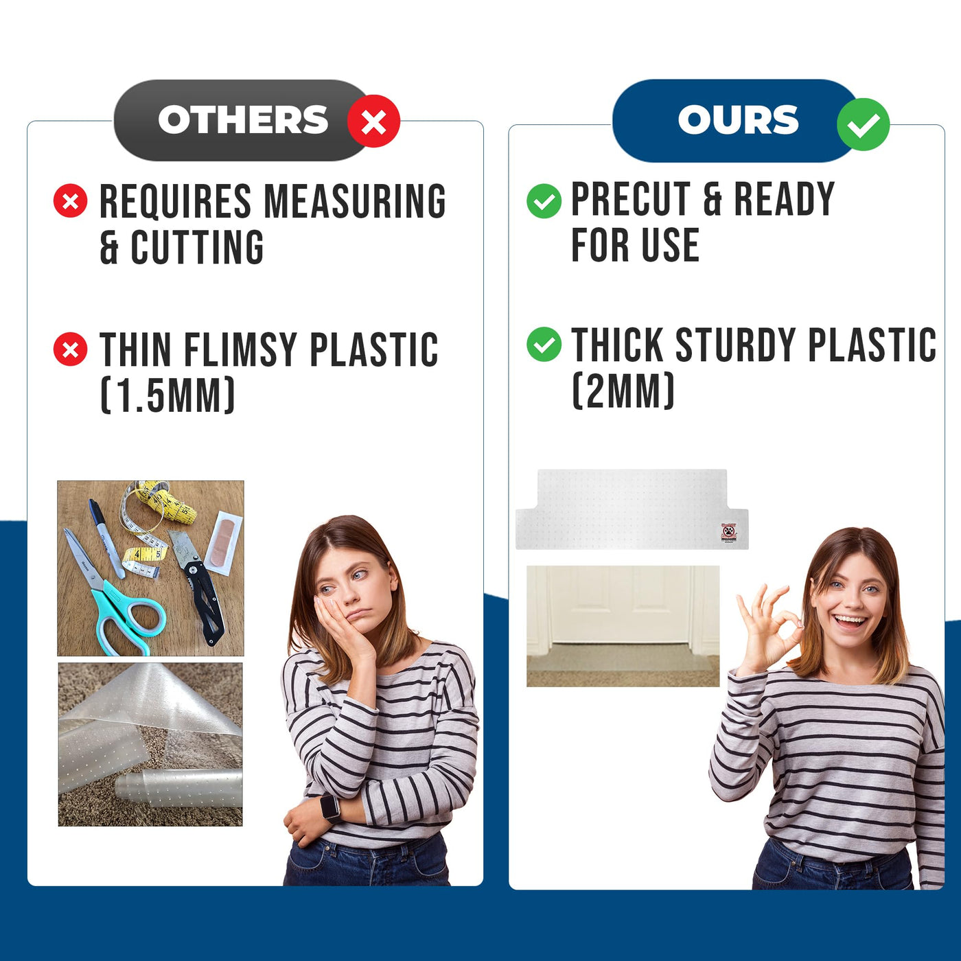 Q: What material is the Carpet Scratch Stopper made from?A: The Carpet Scratch Stopper is made from high-quality, heavy-duty plastic that is 2mm thick, ensuring durability and stability while still allowing normal foot traffic.