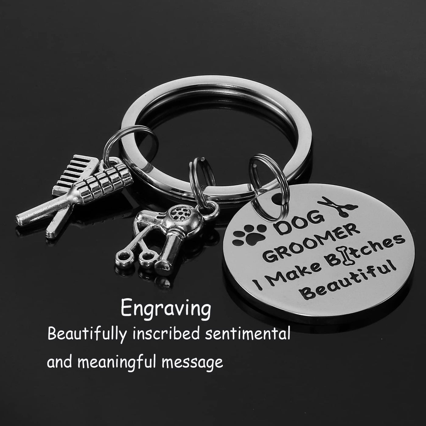 Q: Is the keychain suitable as a gift for dog groomers?A: Yes, this keychain is a perfect gift for dog groomers, pet groomers, and dog lovers. It features an engraved message that makes it a thoughtful present for occasions like birthdays, Christmas, and anniversaries.