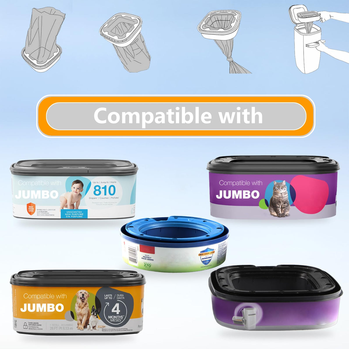 Each Jumbo 28 Ft Long Refill, Compatible With Your Standard, Plus,Xl And Xl+, Save Your Money, Especially For Cat Lovers. Note: Original Refill Cartridge Is Not Included. Save And Reuse Your Empty Refill Cartridges! The Refills Use The Best Material, And Each Refill Is Made Of 7 Layers Film The Refill Bags Are Easy To Assemble, Please Follow The Manual In The Package. Easy To Assemble, Simply Pull Out A Bit Of Film, Push It Through The Center Of The Cartridge And Tie A Knot At The Bottom. Then, Open The Lid And Funnel Of The Pail, Place The Cartridge On Top, And Push The Refill All The Way. Simple Installation Can Save You A Lot Of Time. Package: 10 Pack Of Jumbo Refills, 1 User Manual Are Included.