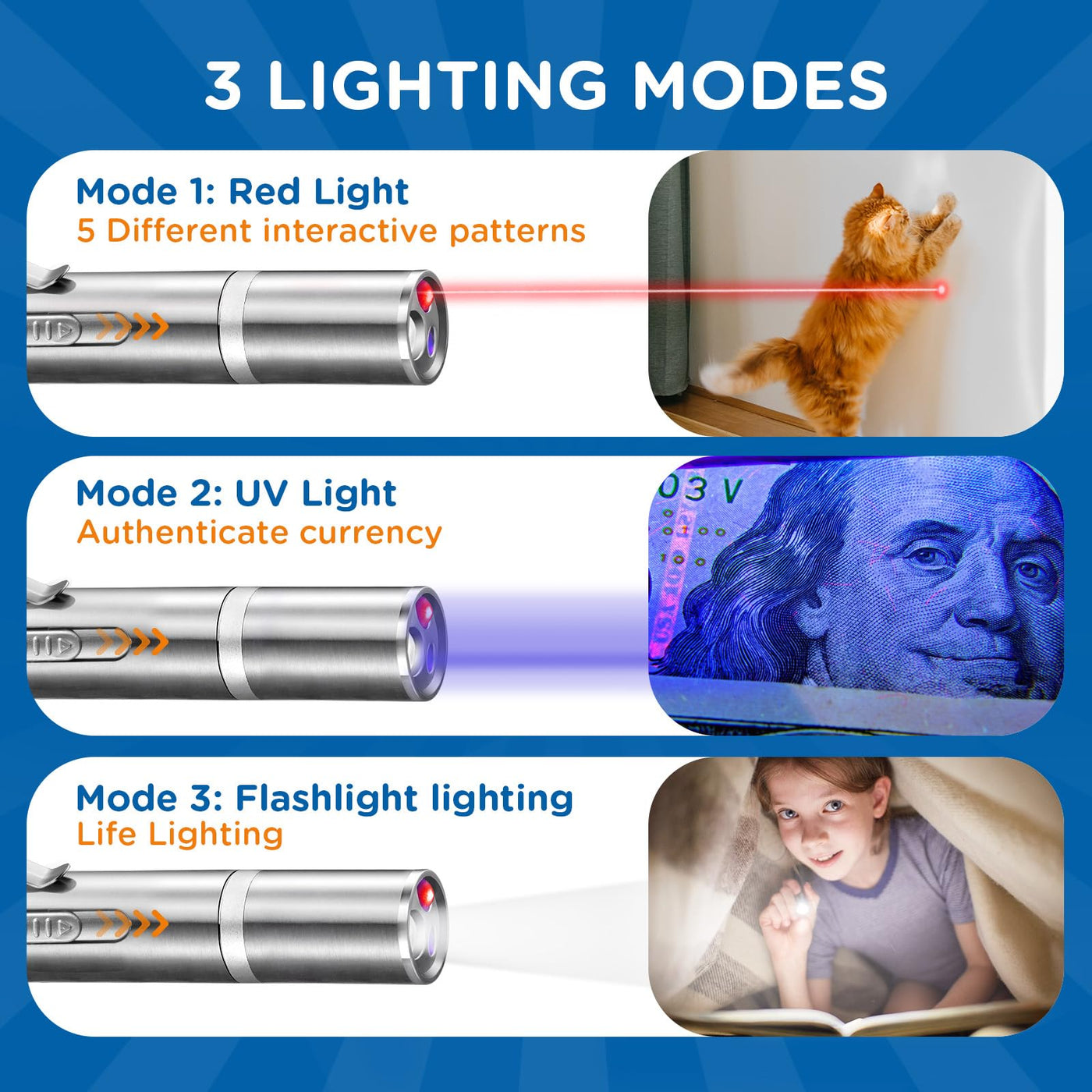 ?7 In 1 Modes?Koackl cat toys has 5 patterns: red dot mice butterfly smile face star. Scoll the black gear on the head to change to 3 different modes: red purple white. You can use the purple to check couterfeit currency and check your pets. White mode can be used for emergency lighting. The red mode can be used to play with your cat or for PowerPoint presentation.