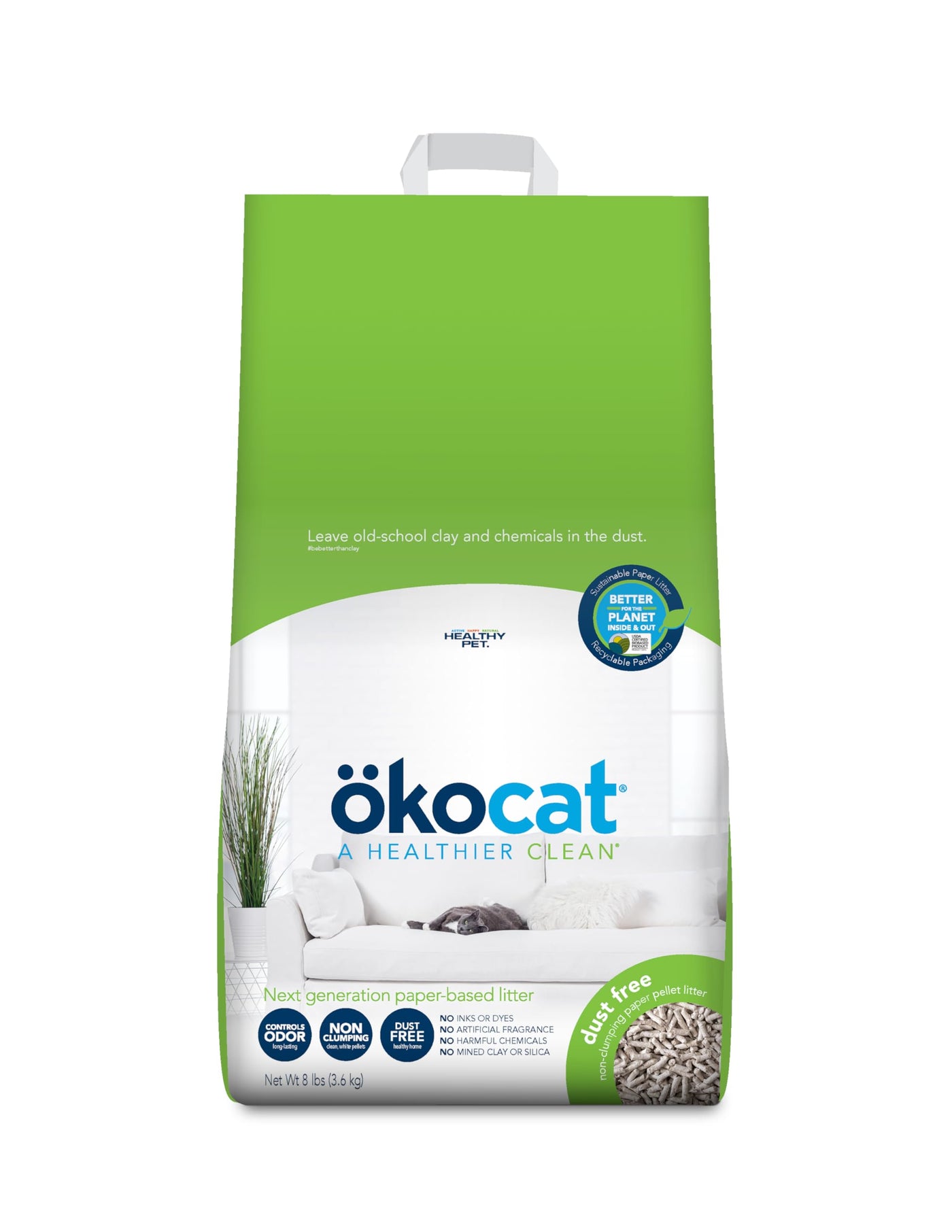 Switch to a superior natural cat litter thats cleaner and healthier for your cat, family, and home. Our next-generation non-clumping, paper cat litter is made entirely from reclaimed, clean white paper fiber. Free from harmful chemicals, inks or dyes, and artificial fragrance, unscented kocat litter boasts long-lasting, plant-based odor control to suppress ammonia odors. Best of all, our non-clumping paper pellet litter is dust-free and low-tracking, ideal for cats with respiratory ailments, homes with allergies or post-surgical needs. oko is German for eco or ecological, meaning green or organic. okocat litter is made from 100% reclaimed paper that comes from the earth and can be returned to the earth. The 100% recyclable paper bag packaging with a convenient strong, paper handle is easy to carry, store, pour, break down and recycle.