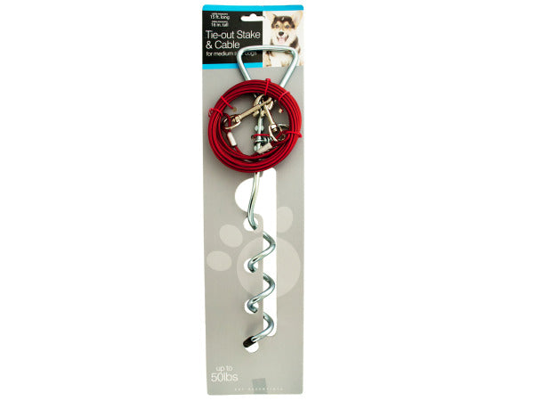 Securely keep your dog from running wild with this Tie-Out Stake & cable featuring a 16" strong metal coiled stake and a 15' plastic-covered metal cable with metal clips For medium dogs up to 50 pounds comes packaged to a tie card