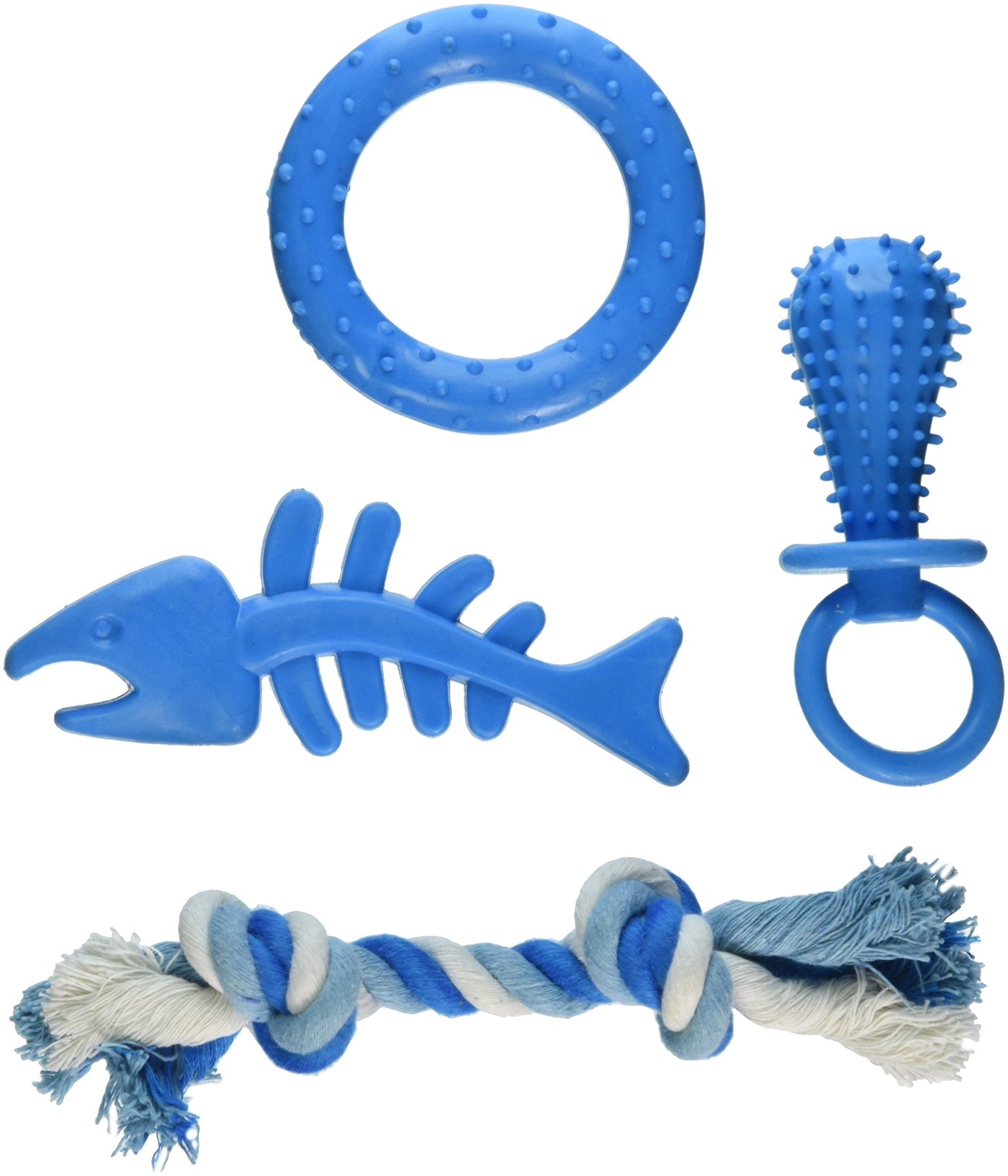 Satisfy puppies natural urge to chew and discourage destructive chewing with this 4-piece Puppy Teeth-Cleaning Toy Set featuring a cotton knotted rope toy, textured pacifier chew toy with bell, fishbone chew toy and textured chew ring toy. Comes packaged in a poly bag with a header card.
