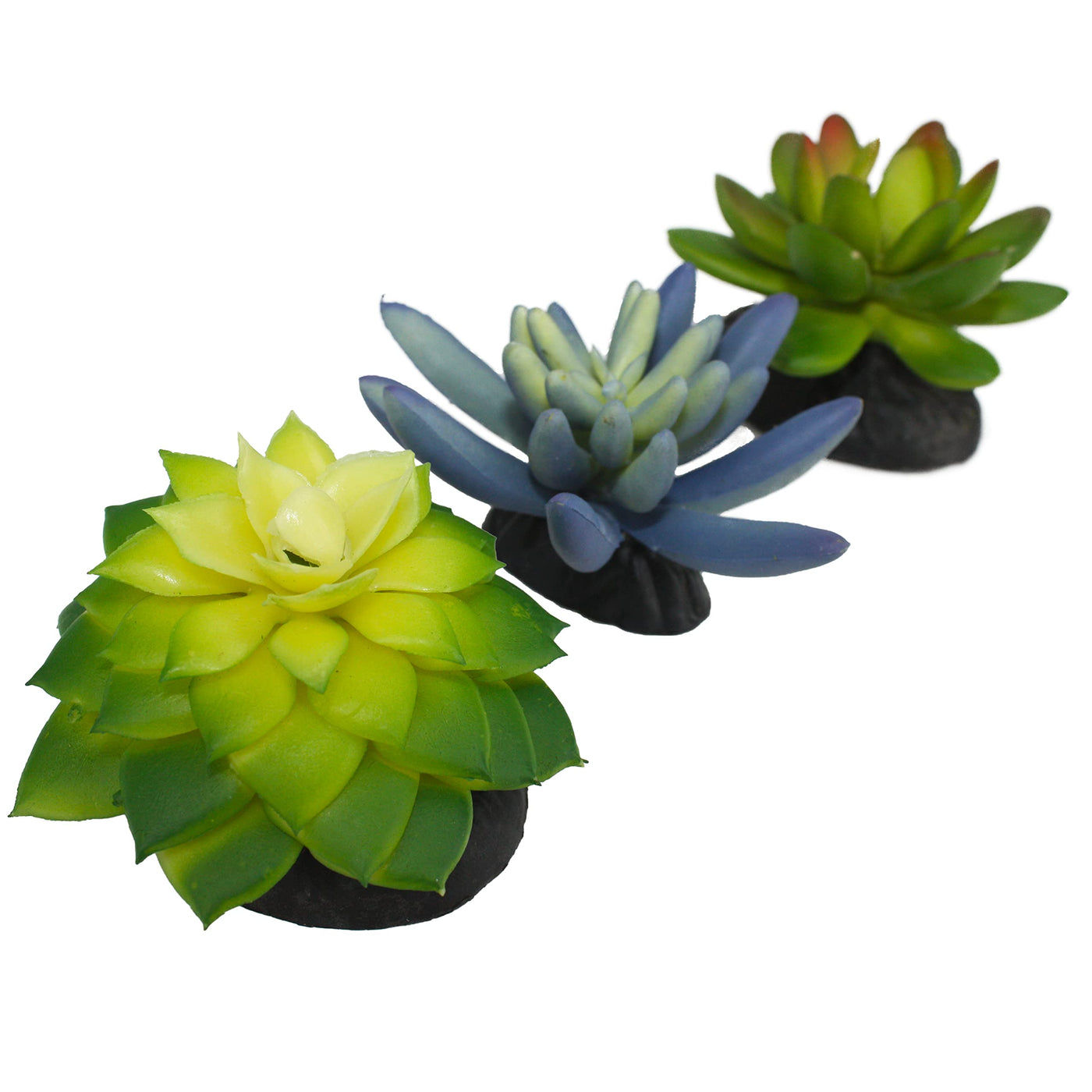 Q: What types of environments can I use these succulents in?A: These succulents can be used in various environments including aquariums, terrariums, and screen cages, making them versatile decorations for any habitat.