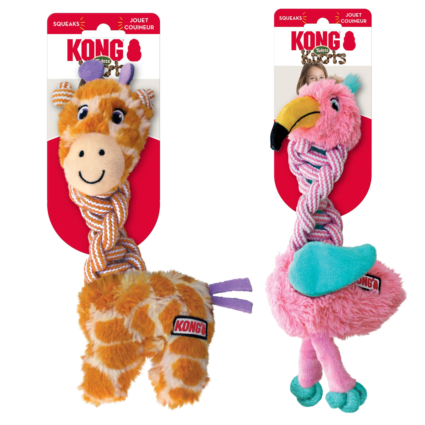 KONG Knots Twists long braided neck satisfies thrashing instincts with an irresistible braid of durable cotton rope dogs love to chew. Squeaker keeps play going while minimal stuffing means easy cleanup for an instinct-satisfying pal thats both soft and durable. Plus, chewing on rope helps clean teeth.