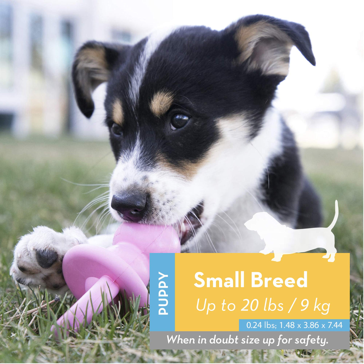 Amazon.comPuppies don't chew up your house just to drive you crazy; they're driven to ease sore gums and try out developing teeth. Redirect your little canine's chewing urges with this adorable, pacifier-shaped chew toy. Made from an exclusive puppy Kong rubber formulation that's more flexible than regular Kongs, these binkies soothe teething pains and encourage healthy mouth and jaw development. They also help puppies learn the appropriate way to channel their chewing urges--an investment that will pay off over the entire lifetime of the dog. And just like the beehive-shaped Kongs, these have a goofy, unpredictable bounce for hours of chasing and fetching fun. Measuring five inches long, this binkie is appropriate for the smallest breeds, including Yorkies, toy poodles, and Chihuahuas. Regularly inspect the binkie for cracks or missing chunks, and replace worn or damaged toys to avoid a choking hazard. Binkies shouldn't be used until a puppy is weaned; when his adult teeth come in at around 6 to 9 months, size up to a red or black adult Kong suitable for your dog's size and chewing habits. Satisfaction is guaranteed; if either you or your dog aren't happy with your purchase, return within 30 days for a full refund. --Mary ParkProduct DescriptionThe KONG Binkie helps teach puppies appropriate chewing behavior. Made from the KONG Classic unique puppy rubber, this toy fulfills instinctual needs to chew while easing aching teeth and gums. The ability to fill the center turns this toy into a fun treat dispensing challenge. Want to extend chew sessions? Stuff with KONG Puppy Snacks and KONG Puppy Easy Treat. Covered by KONG Satisfaction Guarantee. See KONG Satisfaction Guarantee document below for full details.