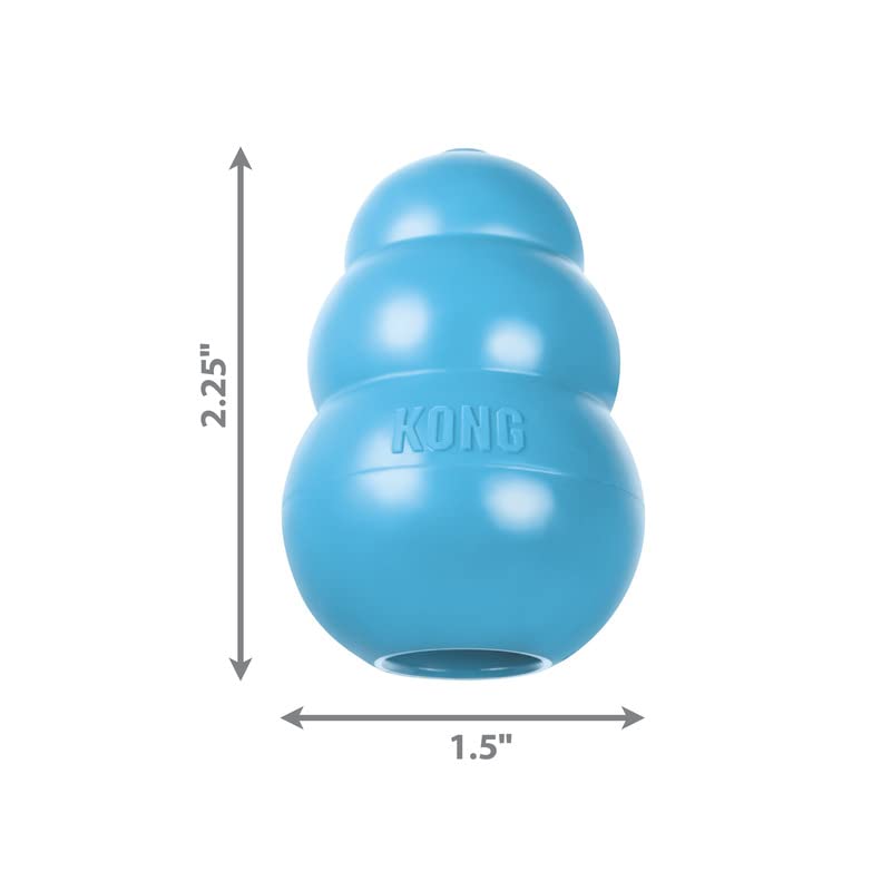 Product DescriptionThe Puppy KONG dog toy is customized for a growing puppy's baby teeth, the unique, natural rubber formula is the most gentle within the KONG rubber toy line. Designed to meet the needs of a puppy's 28-baby teeth, it helps teach appropriate chewing behavior while offering enrichment and satisfying a younger pup's instinctual needs while the erratic bounce make it ideal for those pups that just want to play. A stuffed Puppy KONG occupies busy little ones while allowing pet parents the freedom to attend to their unique needs. Want to make crate training easier or extend play time? Be sure to stuff with puppy kibble and a dash of peanut butter. Add to the fun by including KONG Puppy Snacks and top with KONG Puppy Easy Treat. Covered by KONG Satisfaction Guarantee. See KONG Satisfaction Guarantee document below for full details.From the ManufacturerThe Puppy KONG dog toy is customized for a growing puppy's baby teeth, the unique, all-natural rubber formula is the most gentle within the KONG rubber toy line. Designed to meet the needs of a puppy's 28-baby teeth, it helps teach appropriate chewing behavior while offering enrichment and satisfying a younger pup's instinctual needs while the erratic bounce make it ideal for those pups that just want to play. A stuffed Puppy KONG occupies busy little ones while allowing pet parents the freedom to attend to their unique needs. Want to make crate training easier or extend play time? Be sure to stuff with puppy kibble and a dash of peanut butter. Add to the fun by including KONG Puppy Snacks and top with KONG Puppy Easy Treat.