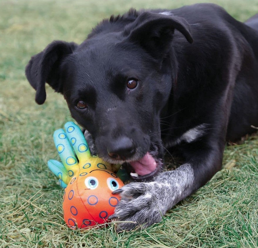 Q: How does the squeaker enhance playtime with the KONG Shieldz Tropics Octopus?A: The built-in squeaker keeps dogs engaged and encourages them to play longer, satisfying their natural chewing instincts.