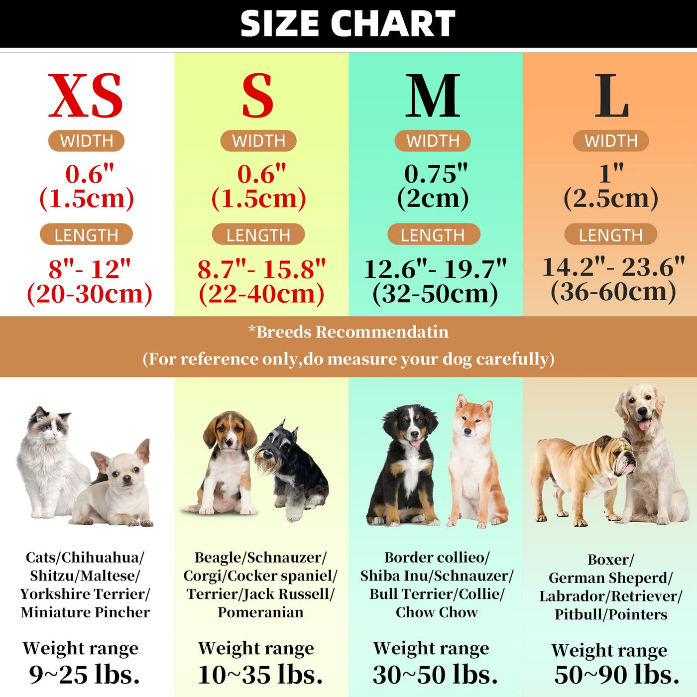 Size Chart (Please measure the width of your pet’s neck before purchasing) XS: Width 0.6', Neck size 8.' -12'