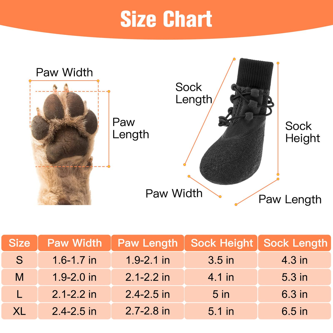 Size L - Paw Width: 2.2'' Length: 2.5'' Height: 5''. Please measure the size according to our size chart before purchasing you can choose the right size for your dog to get the most comfortable fit.