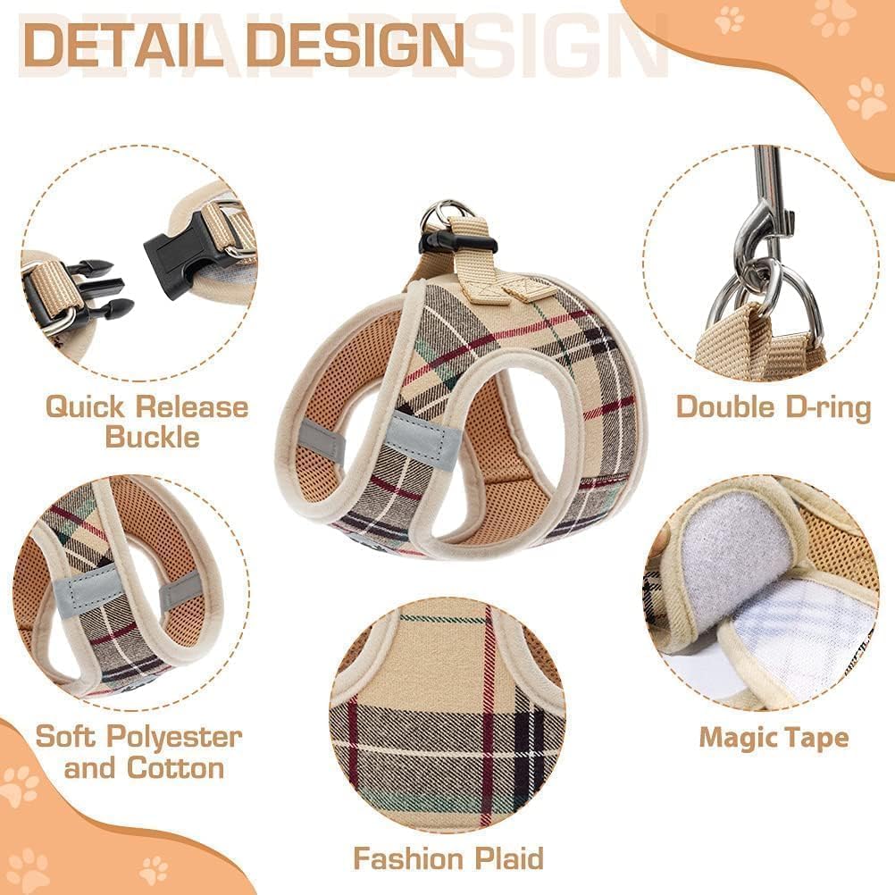 Size Small: Neck Girth 10.5'' - 12.5''; Chest Girth 14'' - 16''; Leash Length 58.5'', Width 0.6''. Please Measure Your Dog/Cat Carefully And Refer To The Size Chart. | Quality Material: Made Of 100% Polyester, Which Is Soft, Lightweight, And Breathable Fabric. This Air-Mesh Dog Harness Is Designed To Reduce Tugging And Pulling On Your Pet'S Neck. No Complex Decoration, But Comfortable And Safety Performance. | Reflective: The Reflective Material Will Make Your Dog More Visible And Safe In Dark. It Makes Drivers Have A Long Time To React If Your Dog Is On The Road. Reflective Straps Are Really Nice While Out For A Walk. | Classic Plaid Pattern: Unique Beige Plaid Design Is Not The Latest Fashion, But It'S Never Out Of Date. Simple Style Suits Almost Any Breeds Of Dog And Integrates Into Different Environments. Your Dog Would Be Attractive And Cute When Wearing. | Easy Step-On: The Hook&Loop And Quick-Release Buckle Make It To Effortlessly Slip On Or Off Your Dog In Seconds. Each Harness Is With A Leash, Double D-Rings Allow Them To Connect Securely. Great For Walking, Running, Hiking, And All Outdoor Activities.
