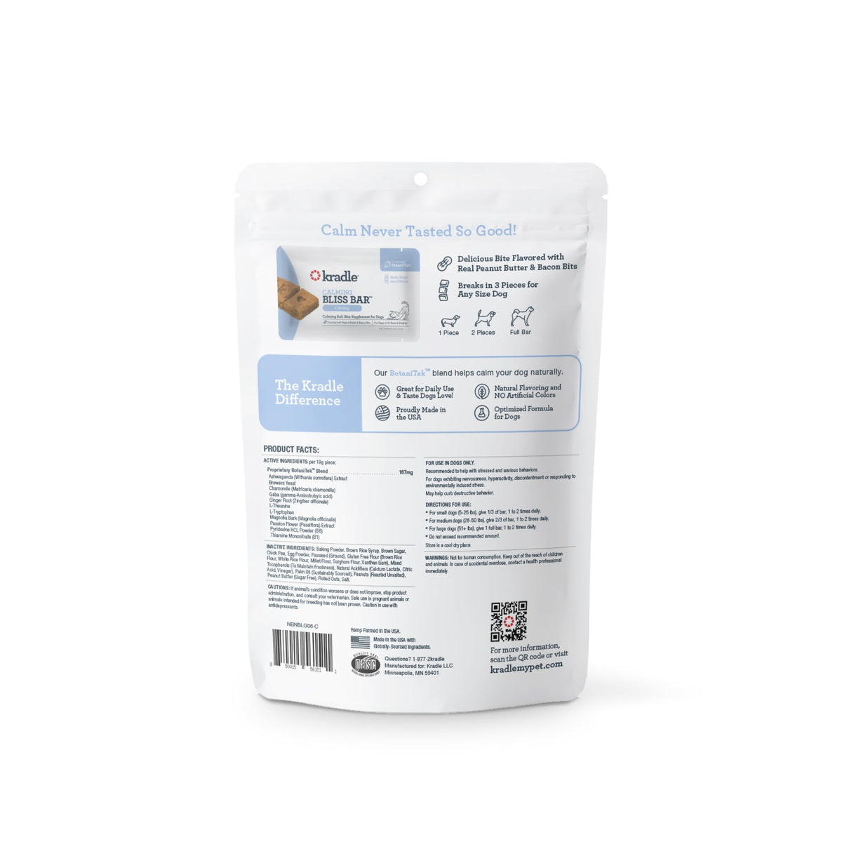 Kradle Bliss Bars are soft, chewy, and irrestibly tasty soft bars to manage normal stress and anxiousness. These calming bars for dogs are packed with real peanut butter and savory bacon bits. Each Bliss Bar is individually wrapped making them perfect for on-the-go pups. Formulated with our proprietary BotaniTek Calming blend of natural ingredients including Ashwagandha, Chamomile GABA, L-Theanine and Magnolia Bark, the calming bars help maintain normal emotional balance and help keep your pet calm and relaxed. Wherever you are, your dog wont be able to resist the delicious peanut butter and bacon flavor and soft chewiness of a Bliss Bar. Kradle Bliss Bars are also Pet Parent aprroved! See what others are saying: Our little buddy cant get enough of these Bliss Bars. Theyve become his favorite treat, and they help him relax in no time. - Emily R. The Bliss Bars are a lifesaver on long trips. They keep our dog calm and the journey peaceful. - Denny H.