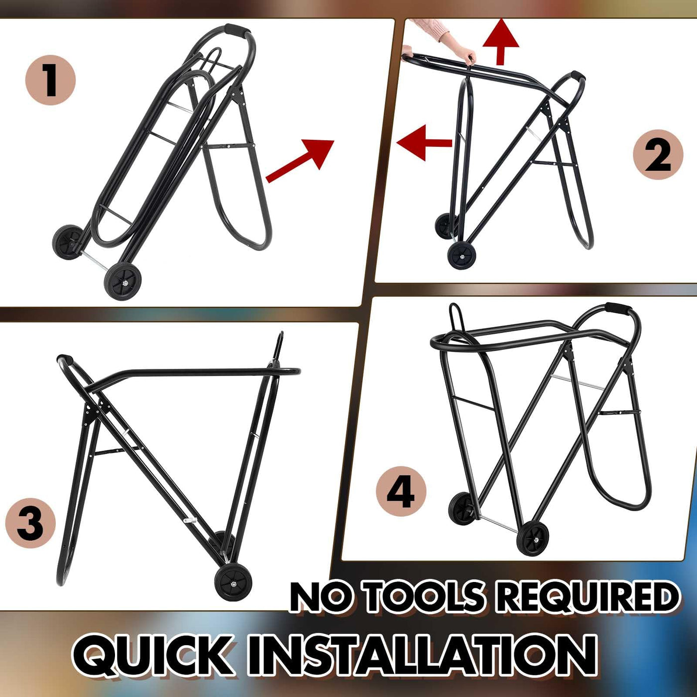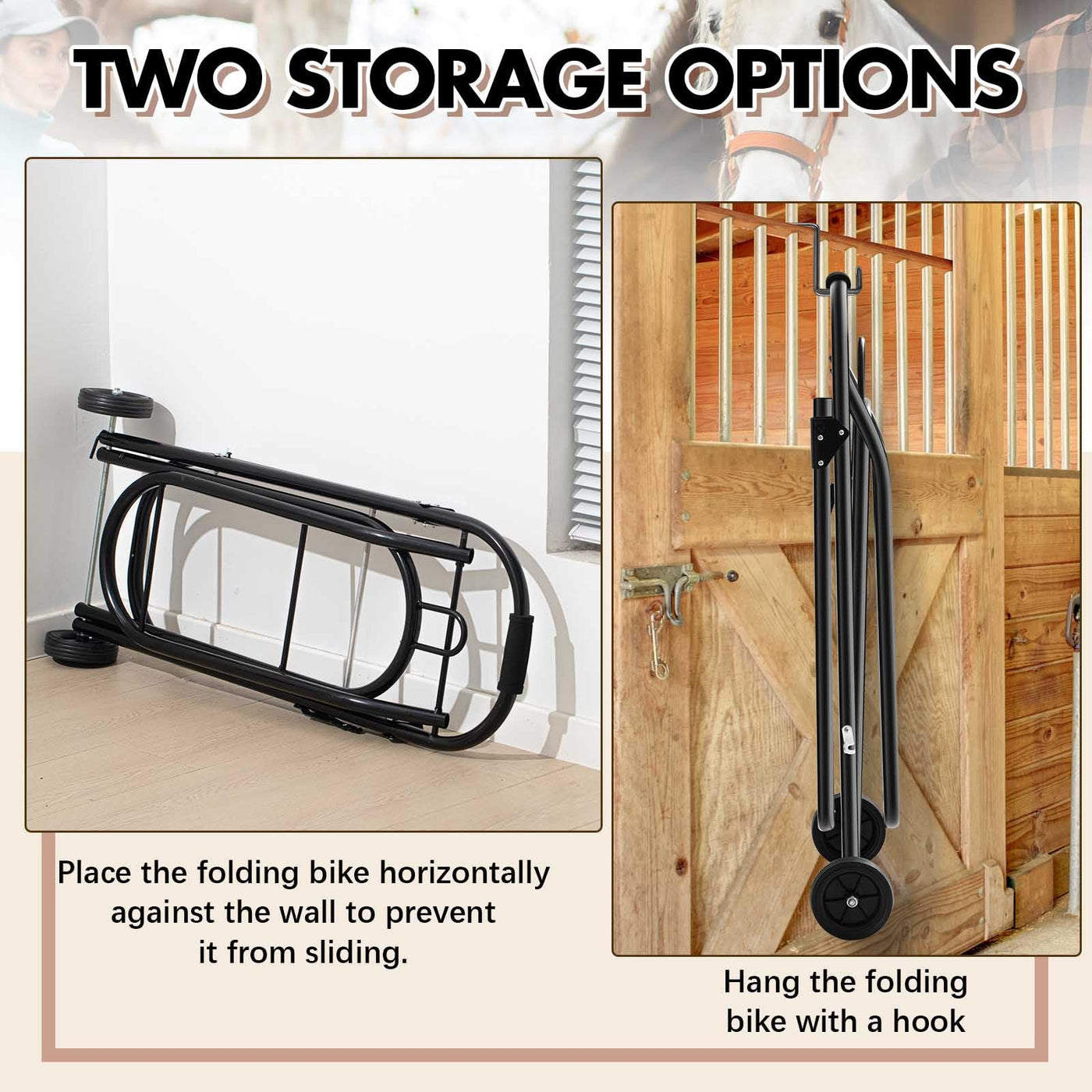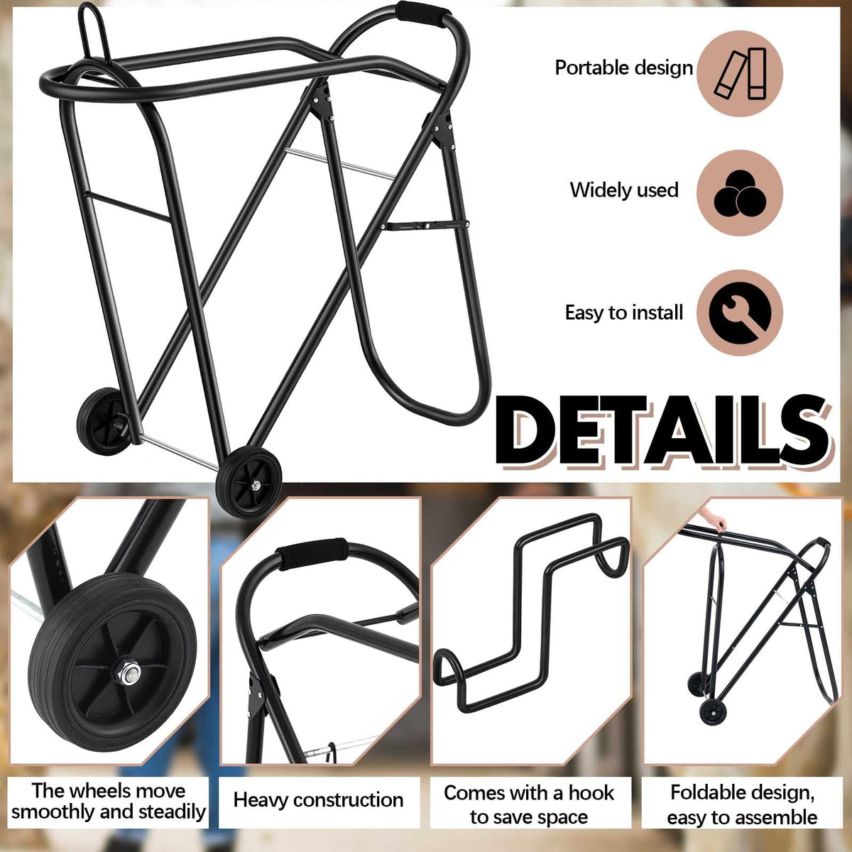 Features: Effortless mobility: Designed for smooth and stable movement, our rolling horse storage cart glides easily over both flat and rugged surfaces. This feature ensures the seamless transportation of your equipment, making it ideal for various outdoor activities, from camping to barn storage. Simplifies your ride preparation: Streamline your horseback riding preparation with our convenient transport solution. Reducing the hassle of moving items back and forth, this cart provides an efficient way to organize and carry your gear, ensuring a stress-free experience before every ride. Specifications: Material: iron Color: black Size: 39.37 x 6.69 x 5.51 inches (folded size) Package includes: 1 x Saddle cart Notes: Manual measurement, please allow slight errors on size. The color may exist a slight difference due to different screen displays.