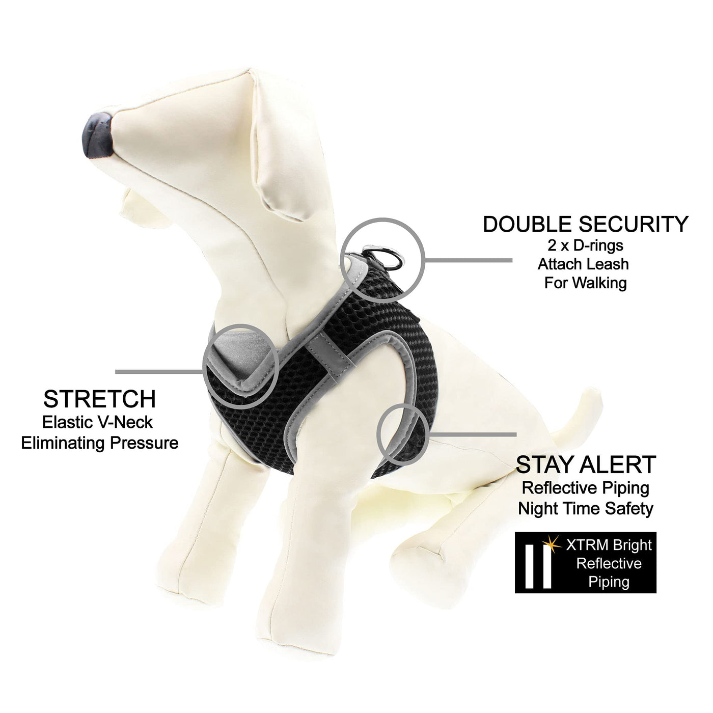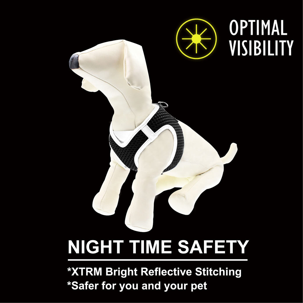 Kruz PET V-Neck Reflective Step In Dog Harness Offering comfort, control and night time safety for you and your best friend, the Kruz PET Reflective Step-In V-Neck Mesh Dog Harness is a super-soft, all weather, no pull harness with a comfortable V-neck for less pressure around the chest and neck than classic dog collars. This no pull dog body harness distributes weight evenly through the chest and shoulders when your dog pulls while walking, and is the perfect dog harness for easier training and outdoor activities without hurting them. The step-in style harness is made of super soft and fray resistant 3mm thick high dense air mesh which is breathable and lightweight, keep your pet cool, ventilated and comfortable. Designed with an adjustable Velcro strap for fast size adjustment and custom fits for different girth sizes, the dog harness features cross-stitched nylon straps for optimal tension distribution and protection against neck injuries.The V-neck vest harness is finished with reflective piping throughout for additional safety when walking the dog in darkness, heavy-duty stitching for lasting quality, and two metal D-Rings for securing the leash. The best adjustable harness to walk your dog or train your puppy with comfort and ease, our cute pet harnesses come in a wide range of bright solid colors that are easy to see at all times. Perfect for dogs of all shapes, breed, and sizes.Design Features100% high quality dense 3mm thick air meshProvides efficient air flow throughout the chest areaHeavy duty D-ring for leash and ID tagDurable plastic side buckle Velcro patch for easy and fast adjustmentReflective piping throughout the entire harness for night time safety