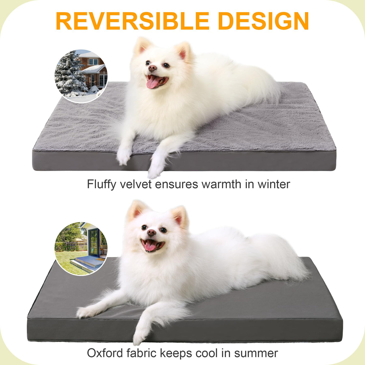 Q: How does the two-sided design of the bed work?A: The KSIIA Orthopedic Crate Bed features a two-sided design, with one side made of ultra-soft plush velvet for warmth in cold weather and the other side made of durable Oxford fabric to keep your dog cool during warmer months.