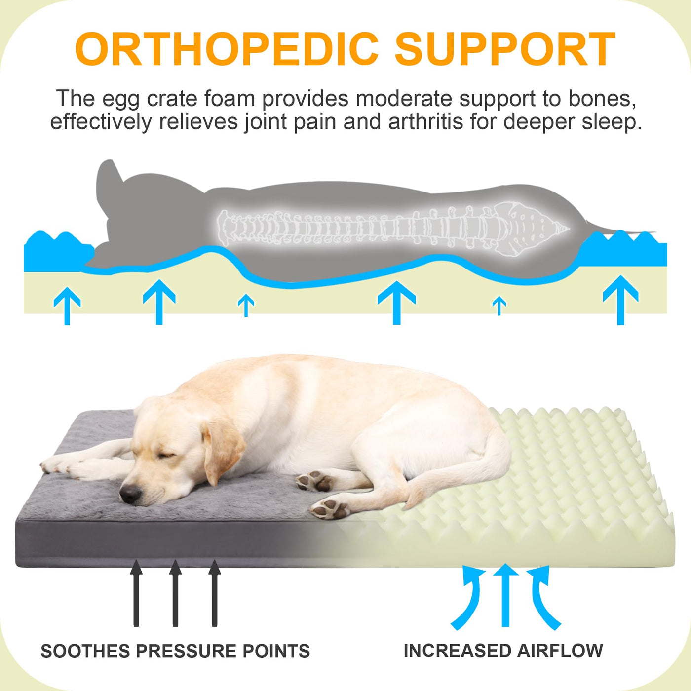 Q: How does the orthopedic support work in this dog bed?A: The bed features a 3-inch thick high-density egg crate foam that evenly distributes your dog's weight, providing strong support to bones and joints, which helps relieve joint pain and encourages restful sleep.