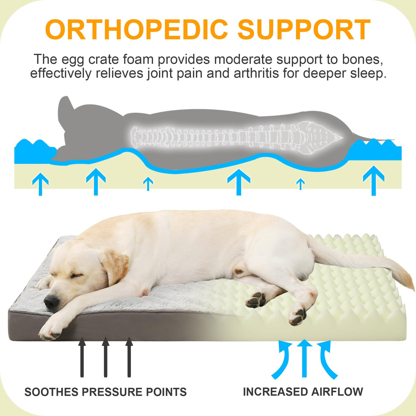 Q: How does the orthopedic support of this dog bed work?A: The bed features a 3-inch thick high-density egg crate foam that evenly distributes your dog’s weight, providing strong support to bones and joints, which helps alleviate joint pain and encourages restful sleep.
