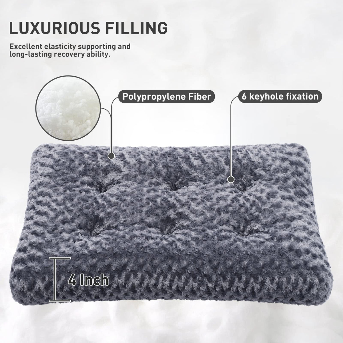The KSIIA dog bed, adopting heavy-weight deluxe plush material, makes it incredibly soft, cozy, and difficult to shed. It is fully stuffed to ensure that your little furry friend is surrounded by warmth and love, which provides improved sleep, helps them relax, and helps them calm down more quickly. Your dog will feel safe and content when they step on or off this improved anti-slip and anti-scratch bottom dog crate bed, which keeps the pad from moving.