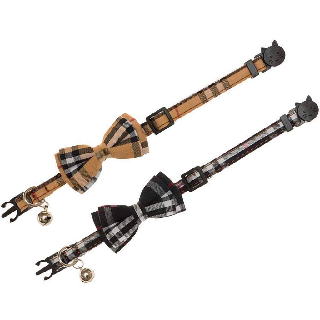 KUDES 2 pack of plaid cat collars with breakaway buckle, which is not only cute, but also provide your cat with safety.Size: 7.8' - 10.5' in length; 2/5' in width Main Color: Brown & Black Material: durable cotton fabric Style: classic plaid style Target Audience: cats, puppies Features: Plaid style The plaid style will always get people's love. With the plaid collar, your cat will be cuter and more fashionable. Breakaway The safe buckle which releases quick when pressure is applied, is a cute cat face. It provides more safety for your cat. On the other hand, it is convenient for you to open it to put on and off. Movable Bowtie The movable bowtie is a great design. It is attached to the collar with two elastic bands. You can adjust the position of the bowtie to show it on the front of your cat's neck. Package Include: 1 x blue & red plaid collar 1 x black & brown plaid collar Notice: Due to manual measurement, there are 0.2' - 0.5' error. Pleasure measure carefully before ordering.