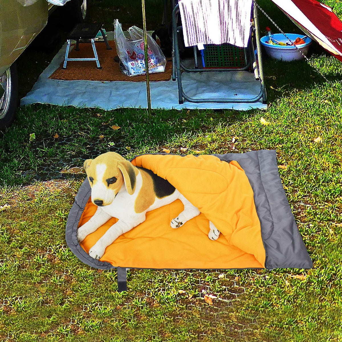KUDES Dog Sleeping Bag Waterproof Warm Packable Dog Bed for Travel Camping Hiking BackpackingFeatures: 1.SURFACE: The camping bed is with durable polyester exterior, water-resistant, quick-drying, and cleans with a shake! 2.INTERNAL: The dog pad is with fleece inside, soft, comfortable and keep warm for your pet. 3.PORTABLE: The dog mat is lightweight, and can be rolled up, great for backpacking or car camping. 4.EASY TO USE: With zipper on the tail and one side of the bag, it's very easy to use for your puppy. 5.With drawstring design on the head keeps your dog stay in the sleeping bag all the night. Can be used as an outdoor dog sleeping bag for travelling hiking camping. 6.Also can be used as a warm soft mat bed on sofa, floor, or at home and backyard. Specification: Name: Dog Sleeping Bag Material: Polyester+fleece Color: Grey and Orange Package Size: 31 x 17 x 17 cm Weight: 800 g Package Include: 1xDog sleeping bag 1xStorage bag With our pet sleep bag, you will not worry about your puppy when travelling hiking camping. KUDES sleeping bag will keep warm and comfortable for your pet. Notes: 1. Due to the light and screen setting difference, the item's color may be slightly different from the pictures. 2. Please allow slight dimension difference due to different manual measurement.