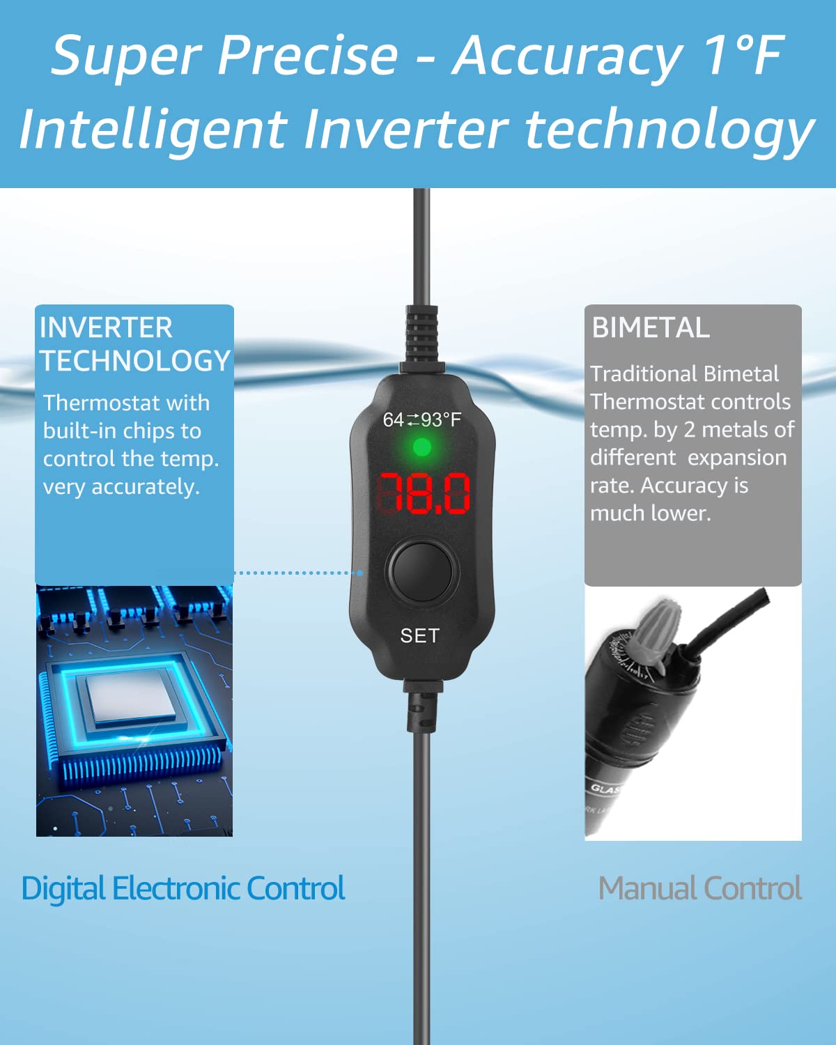 SUPER MINI SIZE - This aquarium heater is SUPER SHORT in length - might be the shortest aquarium heater in the market It is only a bit more than HALF of the length of the traditional aquarium heaters The innovative super short length perfectly solves the headache of the fish keepers on the traditional aquarium heaters Takes up less space easy to hide but in full power Temperature range is 64-93F 50 Watt for 5 - 10 gallon tanks SUPER AccURATE 1 - Thanks to the intelligent inverter technology with the in-built chips the thermostat keeps the fish heater at a constant temperature at an accuracy of 1 much more accurate than the traditional knob-controlled fish heaters and you save your electricity expenses by 50% DIgITAL DISPLAY WITH DOUBLE TEMP READINgS - This fish tank heater comes with an external thermostat with digital display that shows 2 readings - the current temperature and the set temperature - very easy to switch by pressing the SET button and you save an extra thermometer for current temperature measuring DRY RUN OVERHEATINg PROTEcTION - Full consideration of safety With the multiple protections this fish tank heater will stop working when the water level is lower than the minimum water level (DRY RUN PROTEcTION) or when the water temperature exceeds 97F (OVERHEATINg PROTEcTION) You are free from Acooking fishA MEMORY FUNcTION - The last setting is stored in the chips of the thermostat In case of a power cut when the power recovers the fish heater will follow the last setting