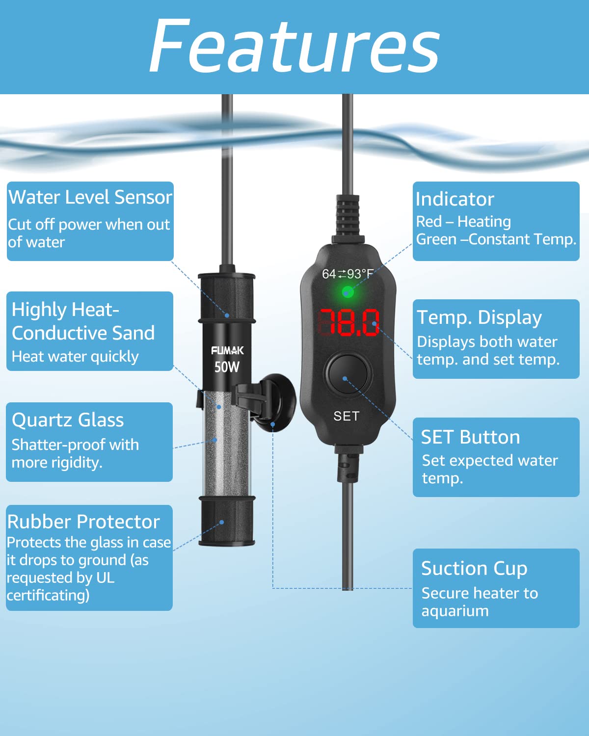 Fumak 50W Adjustable Super Mini Aquarium Heater Small Fish Tank Heater Fish Heater with LED Digital Display Thermostat for Tanks 5-10 gallons