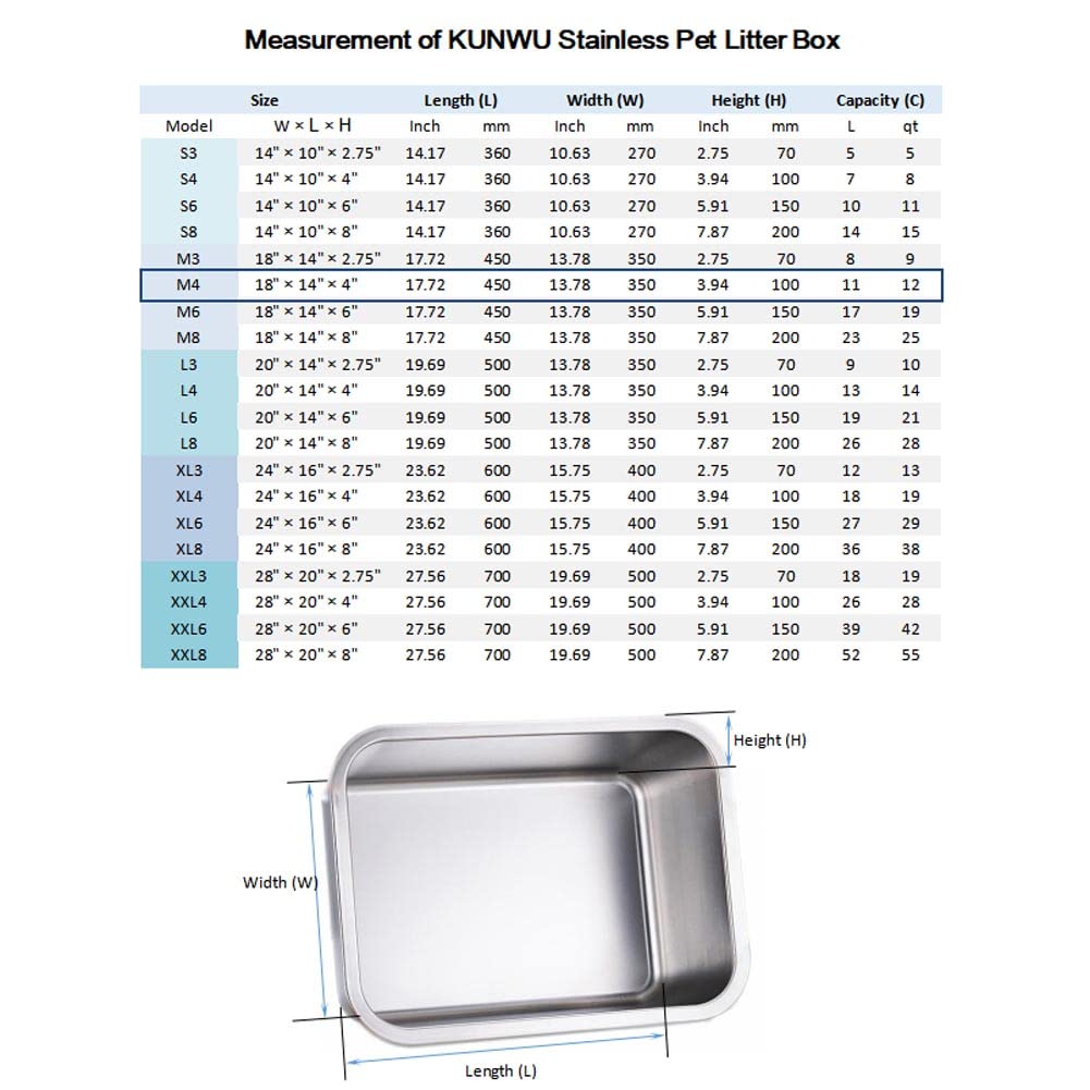 The Real Corrosion Resistant Stainless Steel With Brushed And Polished Surface, Will Never Rust Or Stain, Never Absorbs Any Odor, Ensures Years Of Solid And Bright. For Your Lovely Kittens, The Size That Has 2.75'' Depth And 18'' Width By 14'' Length Will Help Your Pet Habituate To Use It And Love It. The Smooth Polished Rolled Edges Will Be Safe For You And The Lovely Cats, The Rounded Corner Prevent Any Unexpected Injury And Provide A More Comfortable Handing Feeling. Please Note: This Item Has A Deep Of Only 2.75 Inches, This Shallow Side Is Only For Small Or Old Cats To Facilitate Cats To Enter And Leave Easily.
