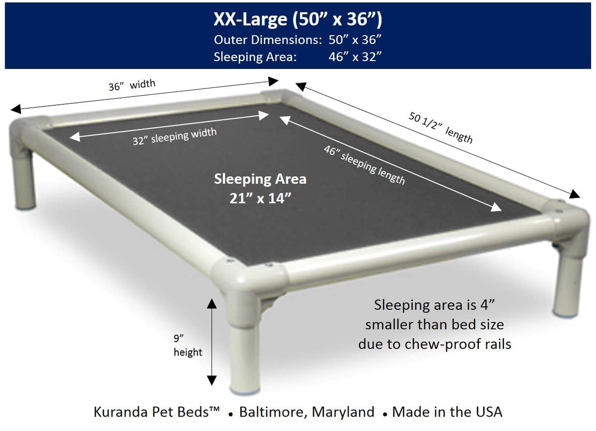 Q: What sizes are available for the Kuranda Chewproof Bed?A: The Kuranda Chewproof Bed is available in various sizes, including the XX-Large size, which measures 50" x 36". This ensures that you can find the perfect fit for your dog, regardless of their breed or size.